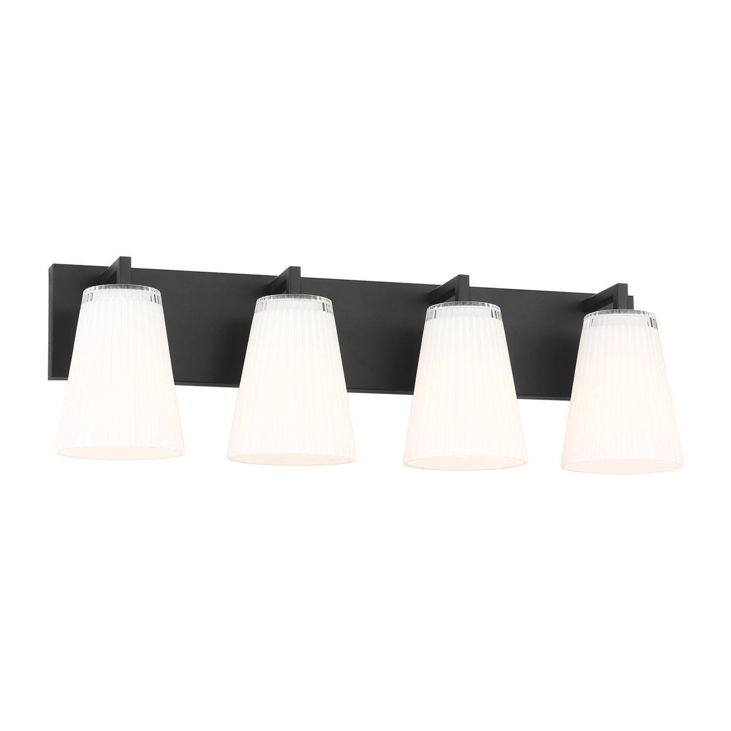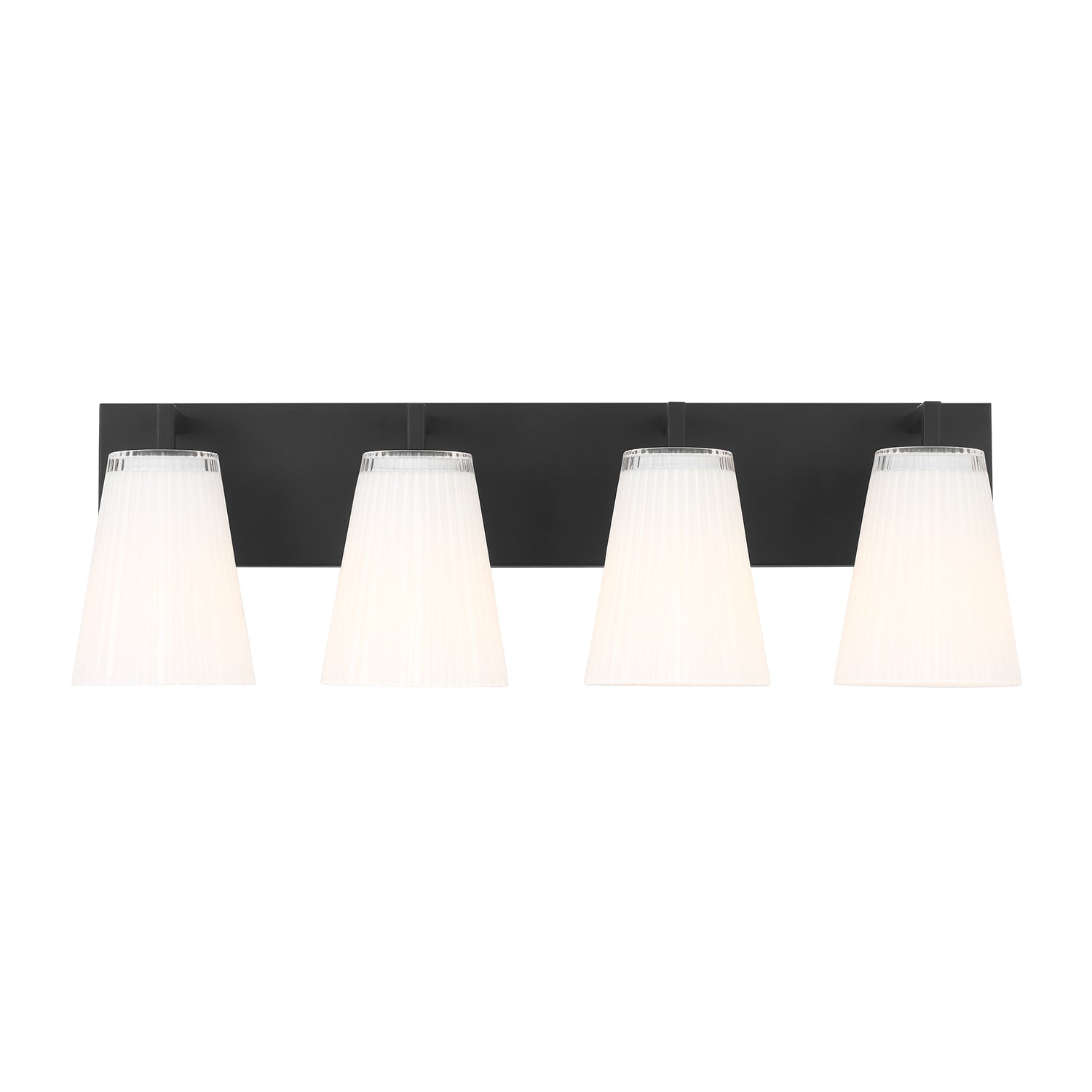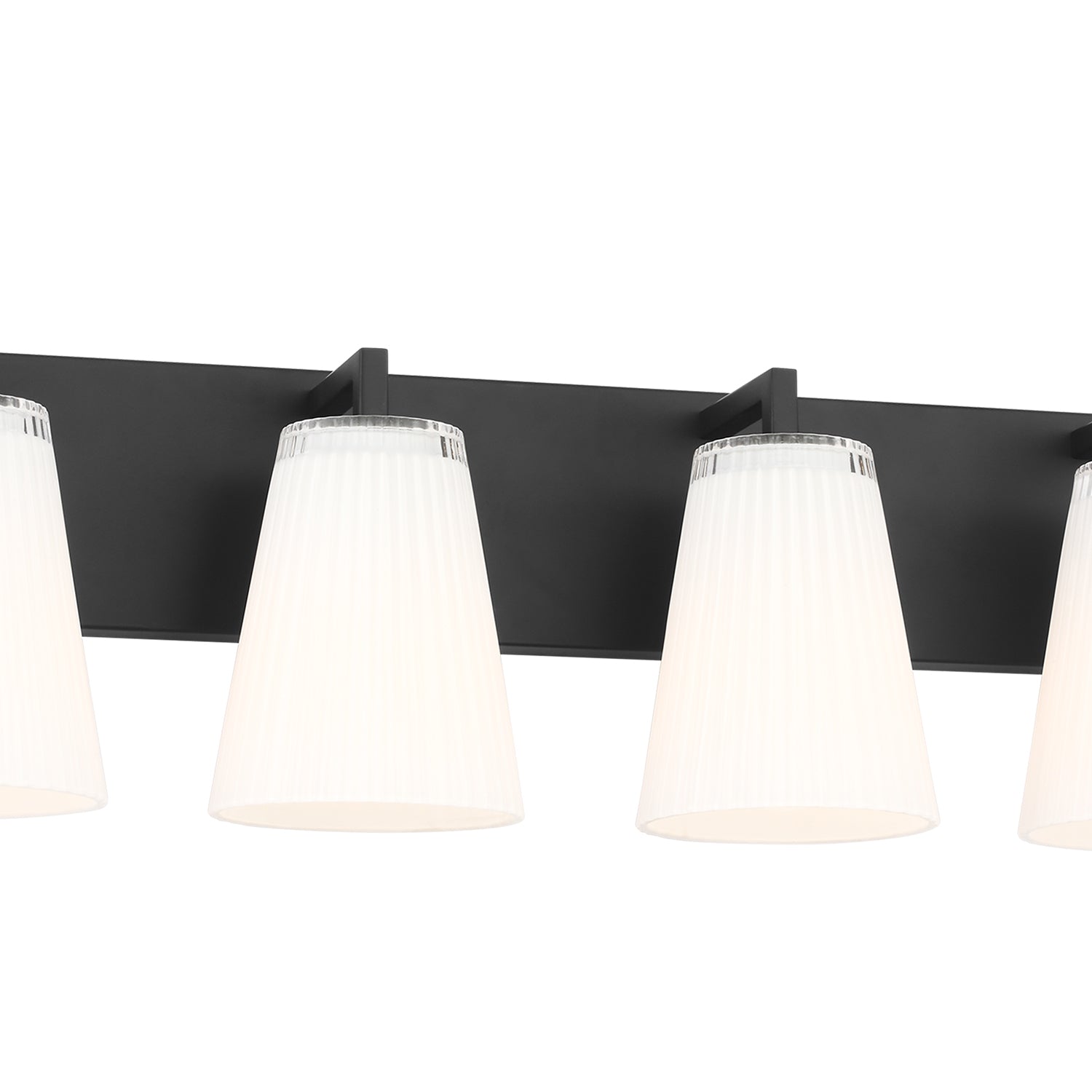 The Margot 4 Light Vanity features clear ribbed glass shades finished with a white interior that creates sophisticated illumination with soft layered glow and refined contemporary appeal. This elegant vanity fixture combines distinctive textural glass with enhanced luminous quality, showcasing four coordinated shades that provide exceptional coverage and balanced lighting distribution across larger vanity areas. The structured framework delivers clean architectural lines while the ribbed glass creates subtle visual interest and optimal light diffusion, perfect for bathrooms, powder rooms, vanity areas, and spaces seeking refined vanity lighting with substantial coverage. The matte black finish creates sophisticated contrast against the structured framework while ensuring reliable daily performance. With its damp-rated construction and generous proportions, this expertly crafted vanity fixture elevates any space with contemporary elegance and dependable functionality.