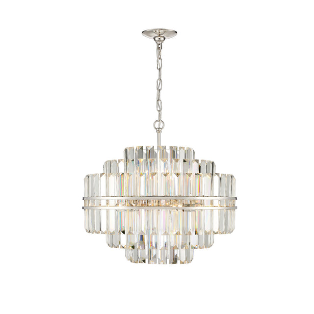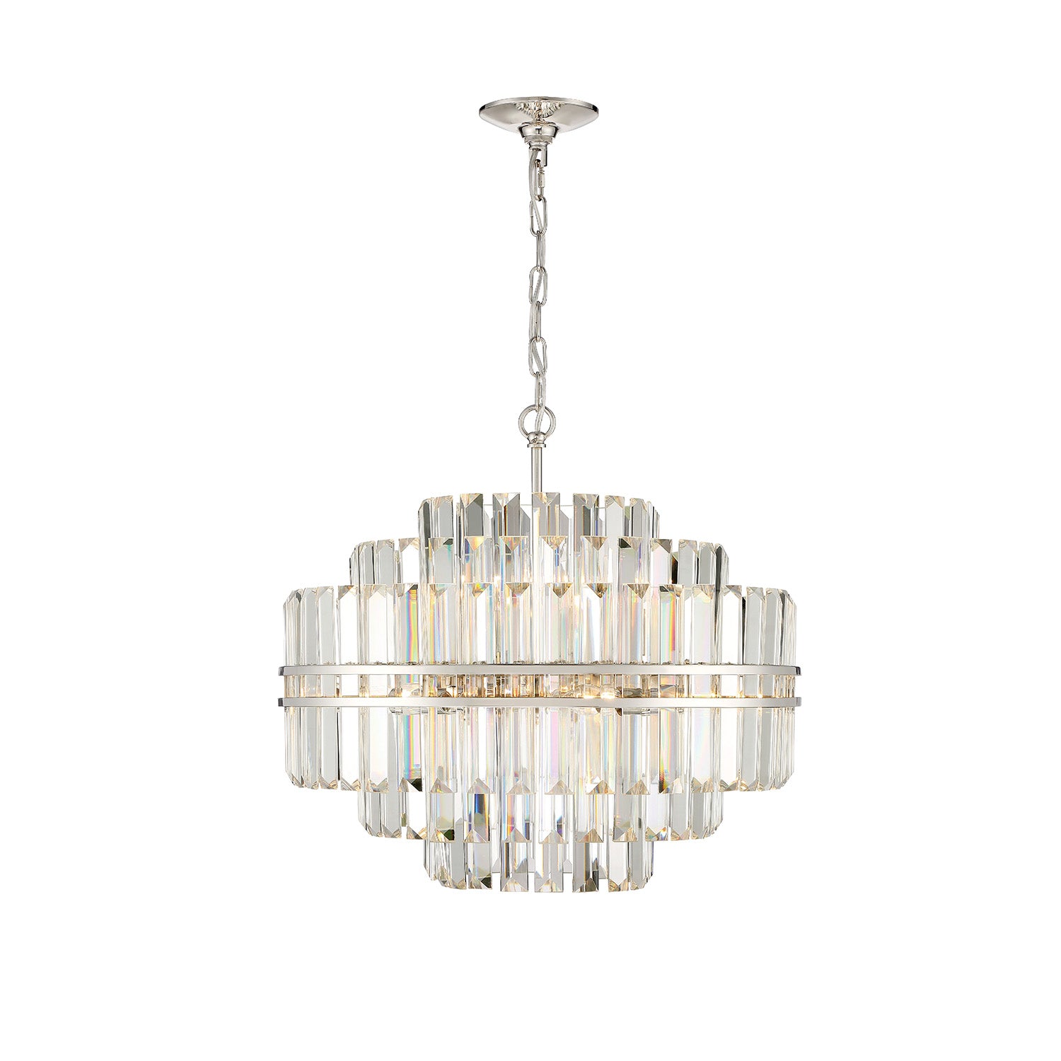 • Elegant round design with hand-cut crystals elegantly arranged in multiple tiers, held by a sleek polished nickel steel frame