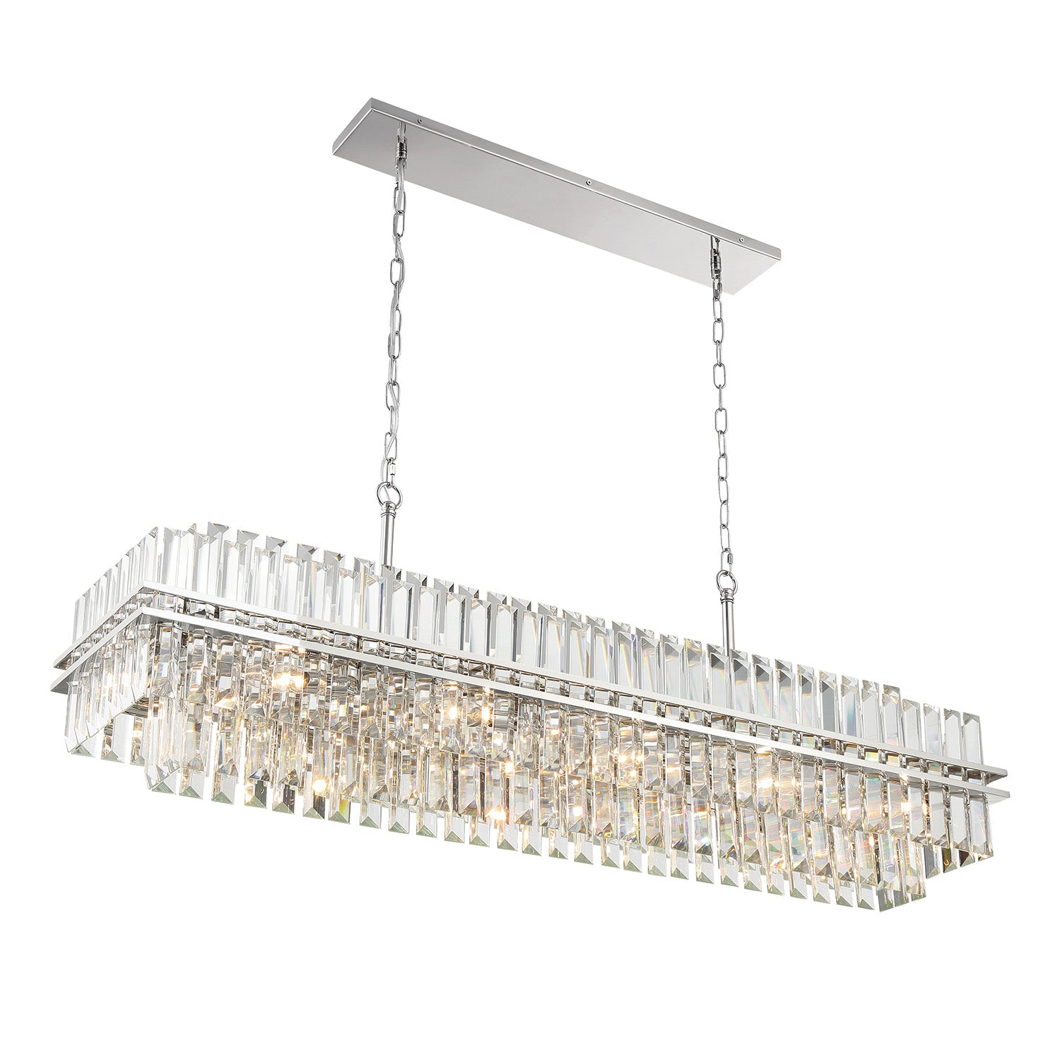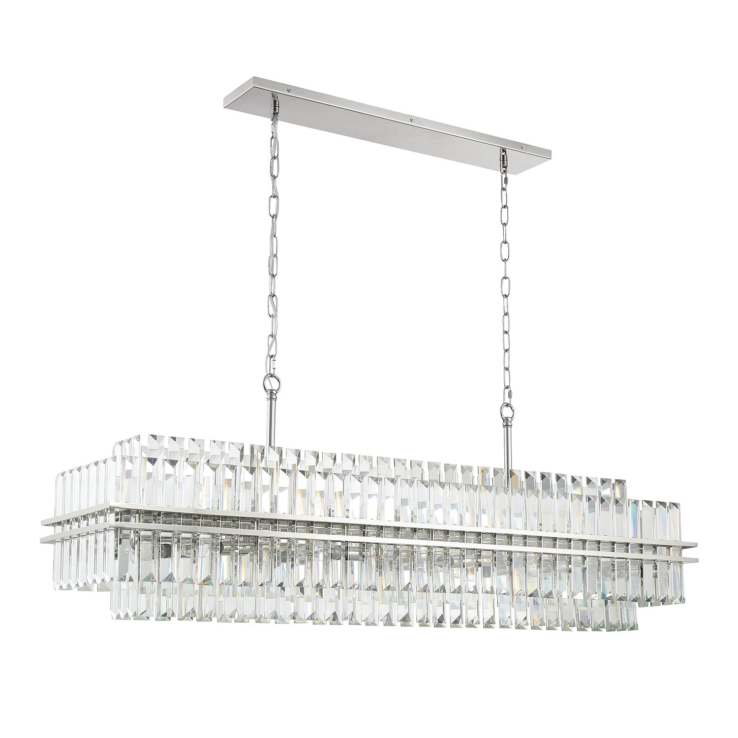 The Maxwell 16 Light Linear Chandelier brings sophisticated elegance to any interior space with its stunning tiered crystal design and lustrous polished nickel finish. This captivating masterpiece features hand-cut crystals arranged in elegant linear tiers, gracefully held by a sleek steel frame that creates mesmerizing light refraction and spectacular illumination. The sophisticated design transforms large kitchen islands, dining rooms, living spaces, and interiors seeking dramatic focal points with luxurious appeal. The tiered crystal arrangement captures and reflects light beautifully, creating captivating sparkle and ambiance that elevates its surroundings. At 50" wide with adjustable hanging height and commanding linear presence, this chandelier makes a lasting impression that brings crystal luxury and refined elegance to any interior.