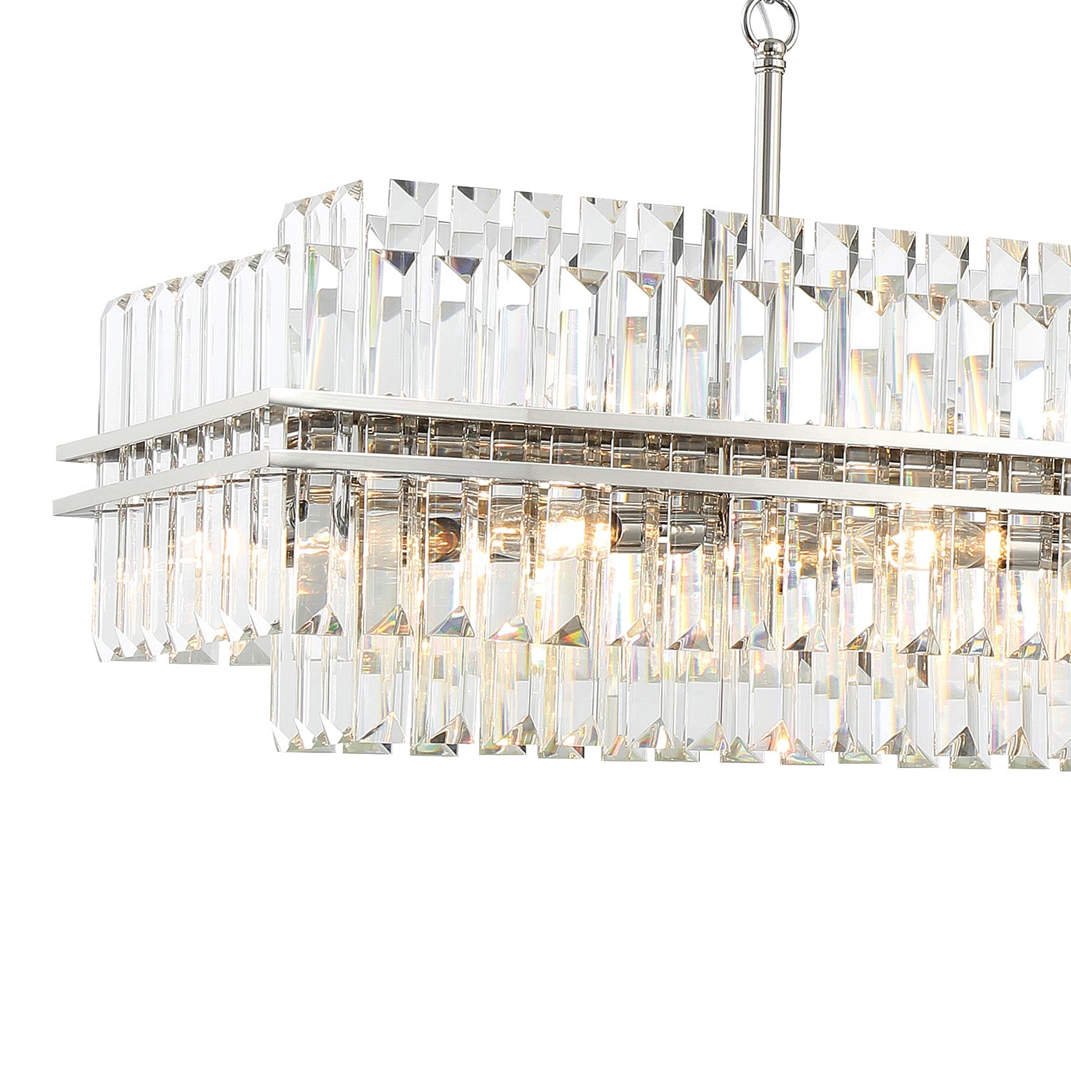 • Linear crystal design with hand-cut crystals elegantly arranged in a tiered formation, held by a sleek polished nickel steel frame