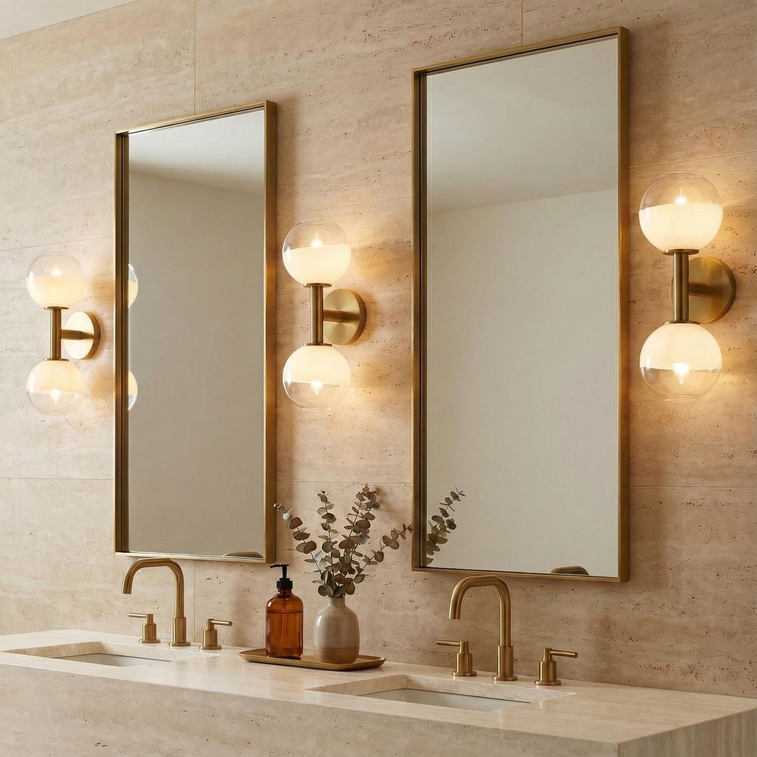 The Merrick 2 Light Wall Sconce features beautiful glass globe shades with an ombre effect, transitioning from milk to etched clear glass to create sophisticated illumination with artistic elegance and refined contemporary appeal. This elegant 15" wall sconce showcases two distinctive ombre glass globes that deliver soft, diffused light while demonstrating the beautiful gradual transition from opaque to translucent elements, perfect for hallways, bedrooms, bathrooms, living spaces, and areas seeking refined wall lighting with sophisticated artistic touch. The modern brass finish brings warm metallic sophistication to the clean framework while the ombre glass globes provide generous ambient lighting with subtle visual depth. With its damp-rated construction and thoughtful extension, this expertly crafted wall sconce elevates any space with contemporary elegance and reliable performance.
