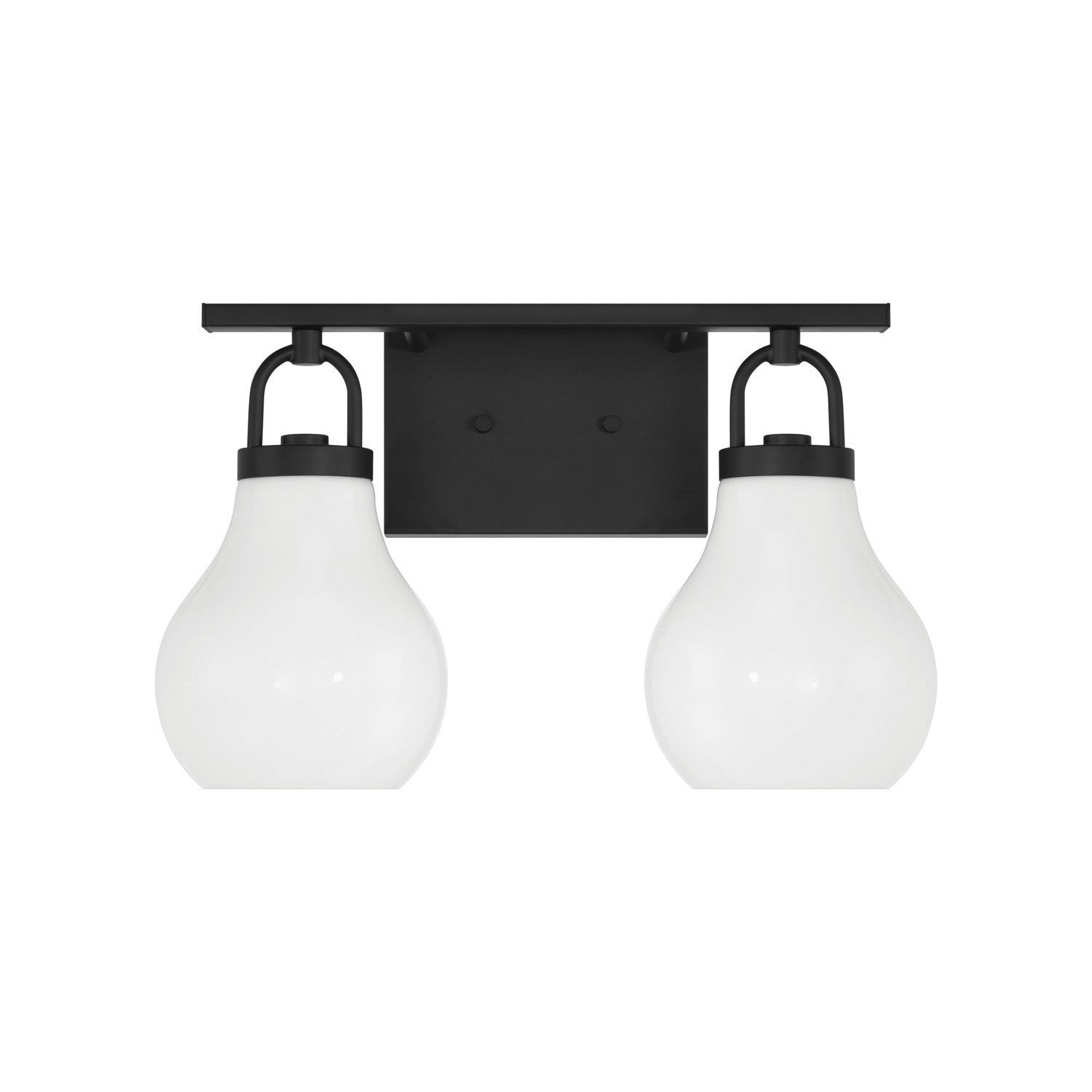 The Naya 2 Light Vanity 16", Matte Black and Opal Glass brings modern simplicity with an effortless sense of refinement to contemporary bathroom and powder room settings. This fixture is characterized by its distinctive architectural details, featuring oversized decorative loops that serve as sophisticated visual anchors for the design. Paired with softly tapered teardrop opal glass shades, the Naya collection creates a graceful and polished presence that complements a wide array of interior styles. The opaque glass diffuses light for a soft, uniform glow, ensuring your vanity area is beautifully illuminated while adding a touch of understated luxury to your daily routine.
