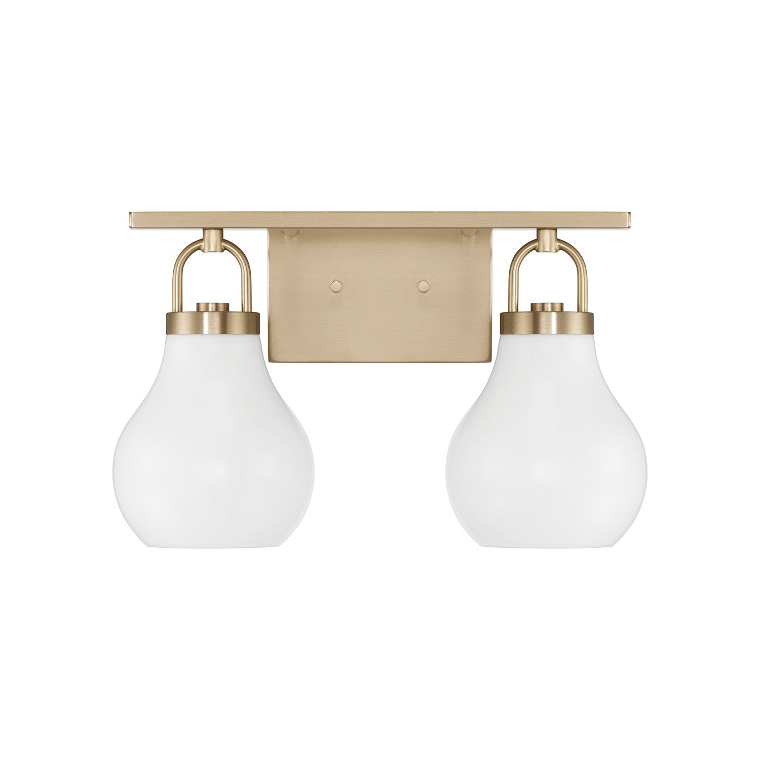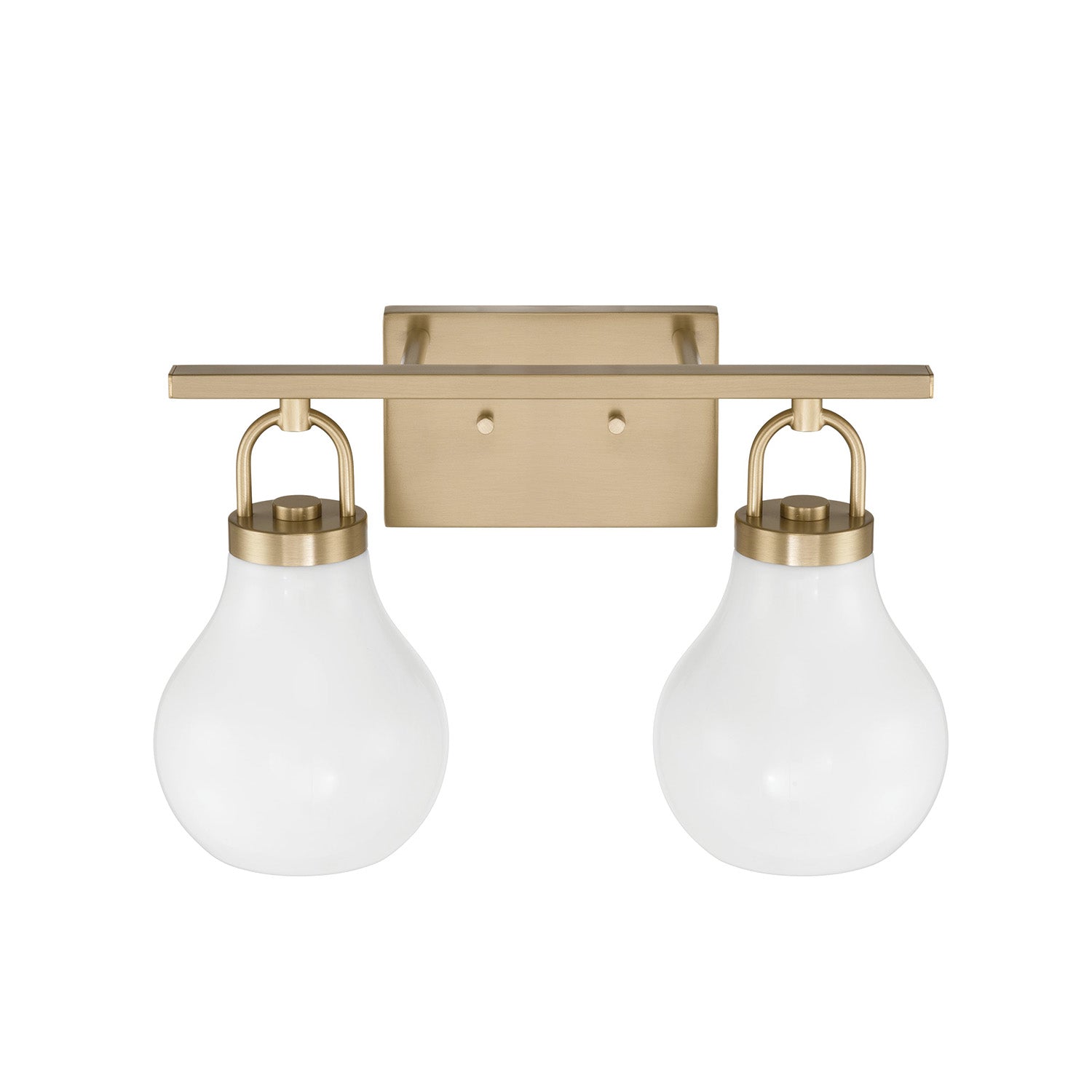 The Naya 2 Light Vanity 16", Satin Brass and Opal Glass brings modern simplicity with an effortless sense of refinement to contemporary bathroom and powder room settings. This fixture is characterized by its distinctive architectural details, featuring oversized decorative loops that serve as sophisticated visual anchors for the design. Paired with softly tapered teardrop opal glass shades, the Naya collection creates a graceful and polished presence that complements a wide array of interior styles. The opaque glass diffuses light for a soft, uniform glow, ensuring your vanity area is beautifully illuminated while adding a touch of understated luxury to your daily routine.