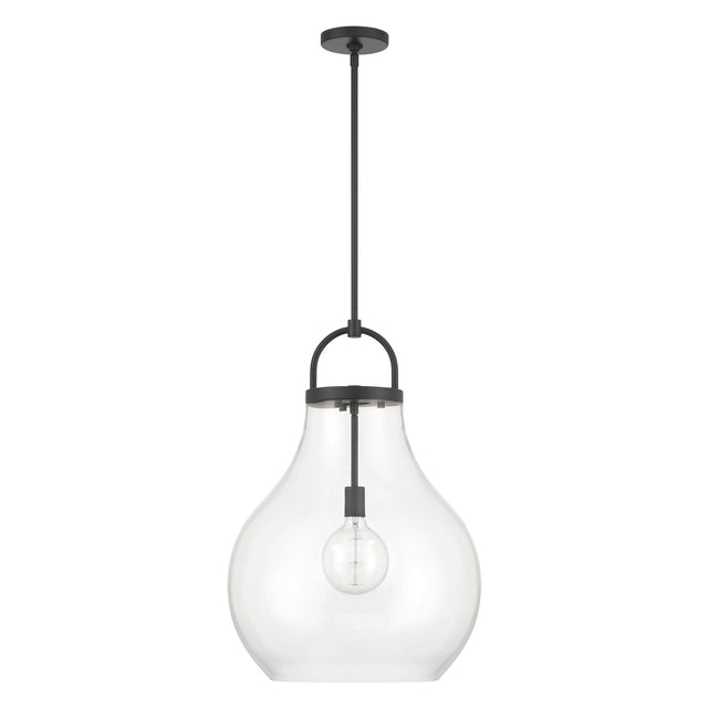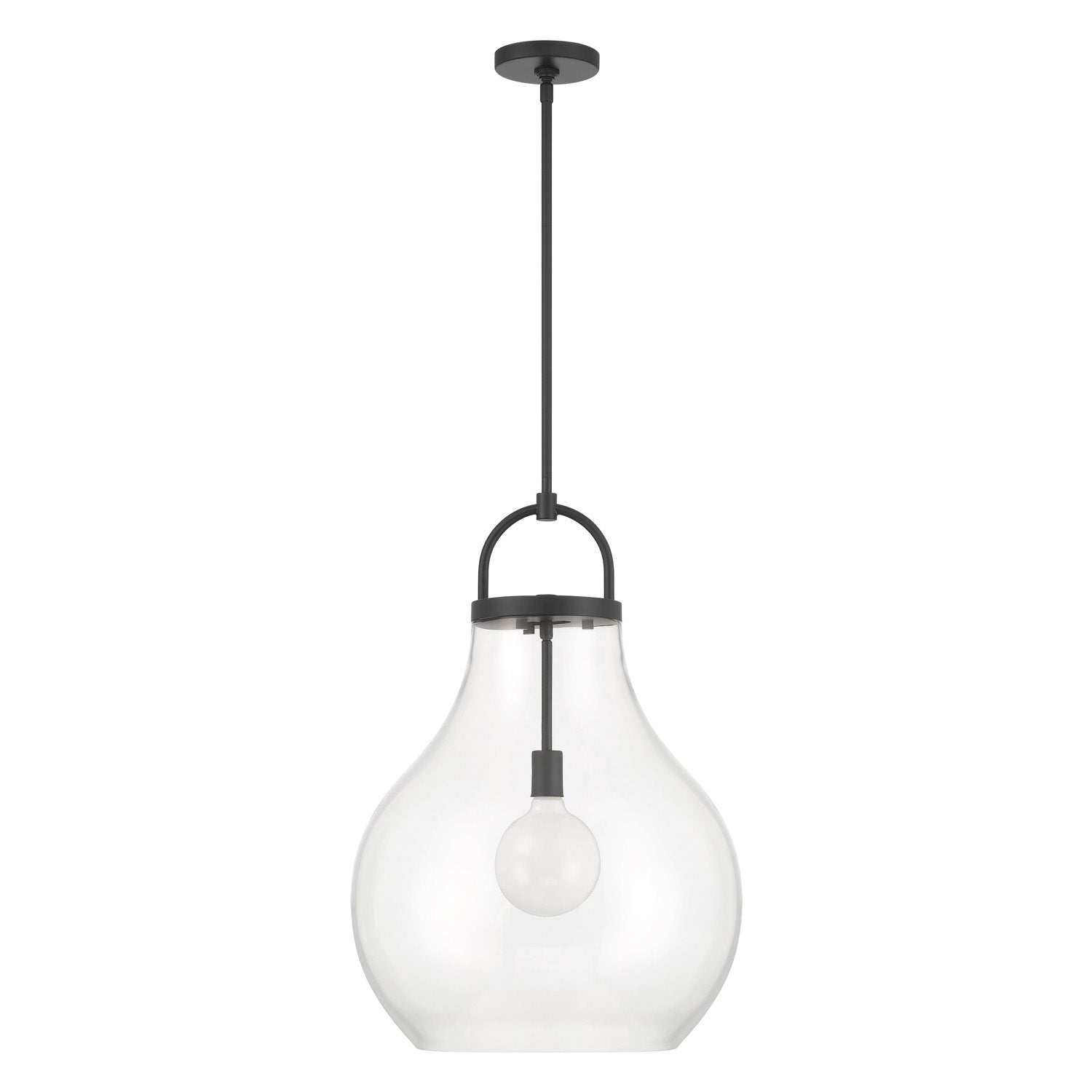 The Naya Large Pendant 18", Matte Black and Clear Glass brings modern simplicity with an effortless sense of refinement to contemporary interior settings. This fixture is characterized by its distinctive architectural details, featuring an oversized decorative loop that serves as a sophisticated visual anchor for the design. Paired with a softly tapered teardrop clear glass shade, the Naya collection creates a graceful and polished presence that complements a wide array of interior styles. The transparent glass allows for maximum light output, ensuring your space is brilliantly illuminated while adding a touch of understated luxury to your home.