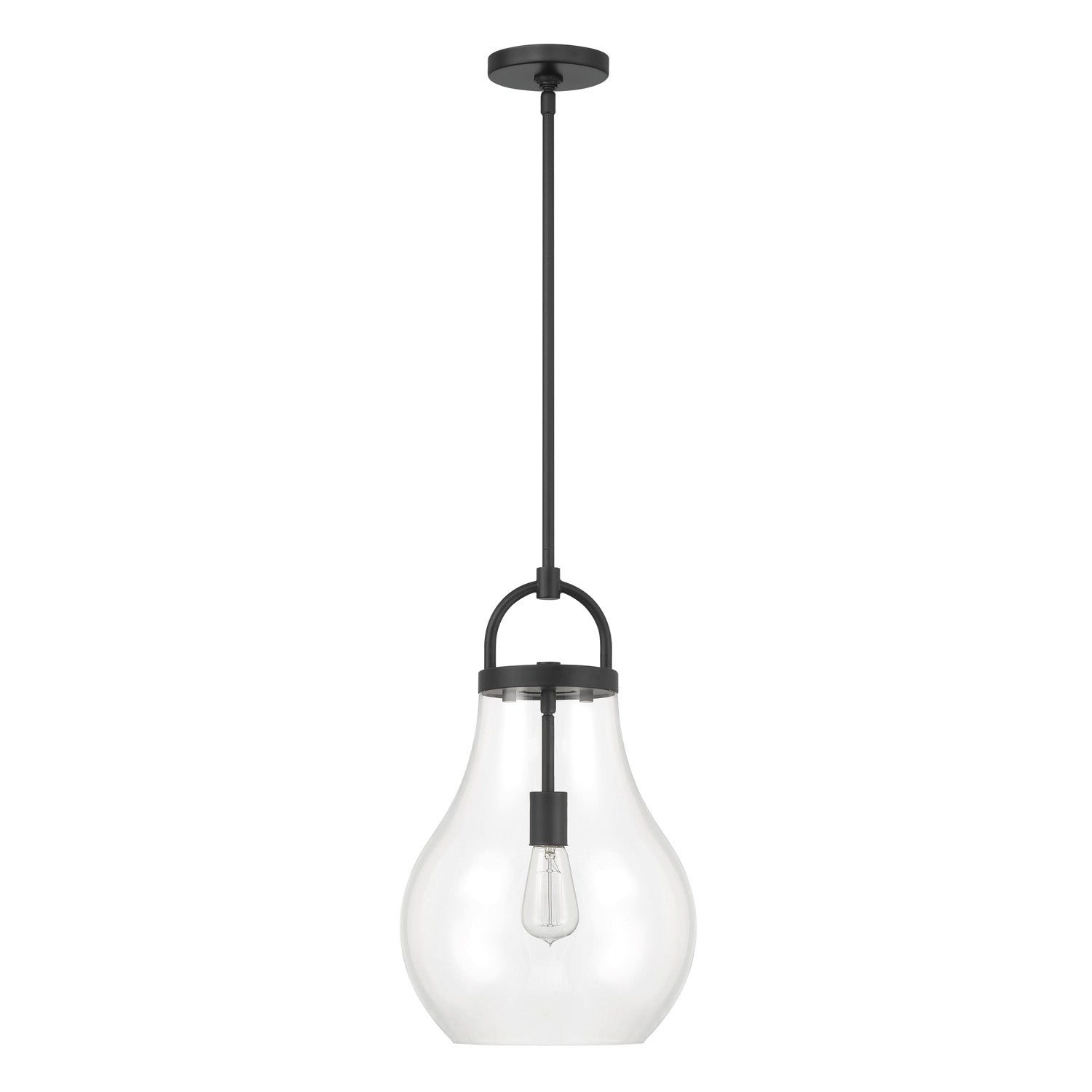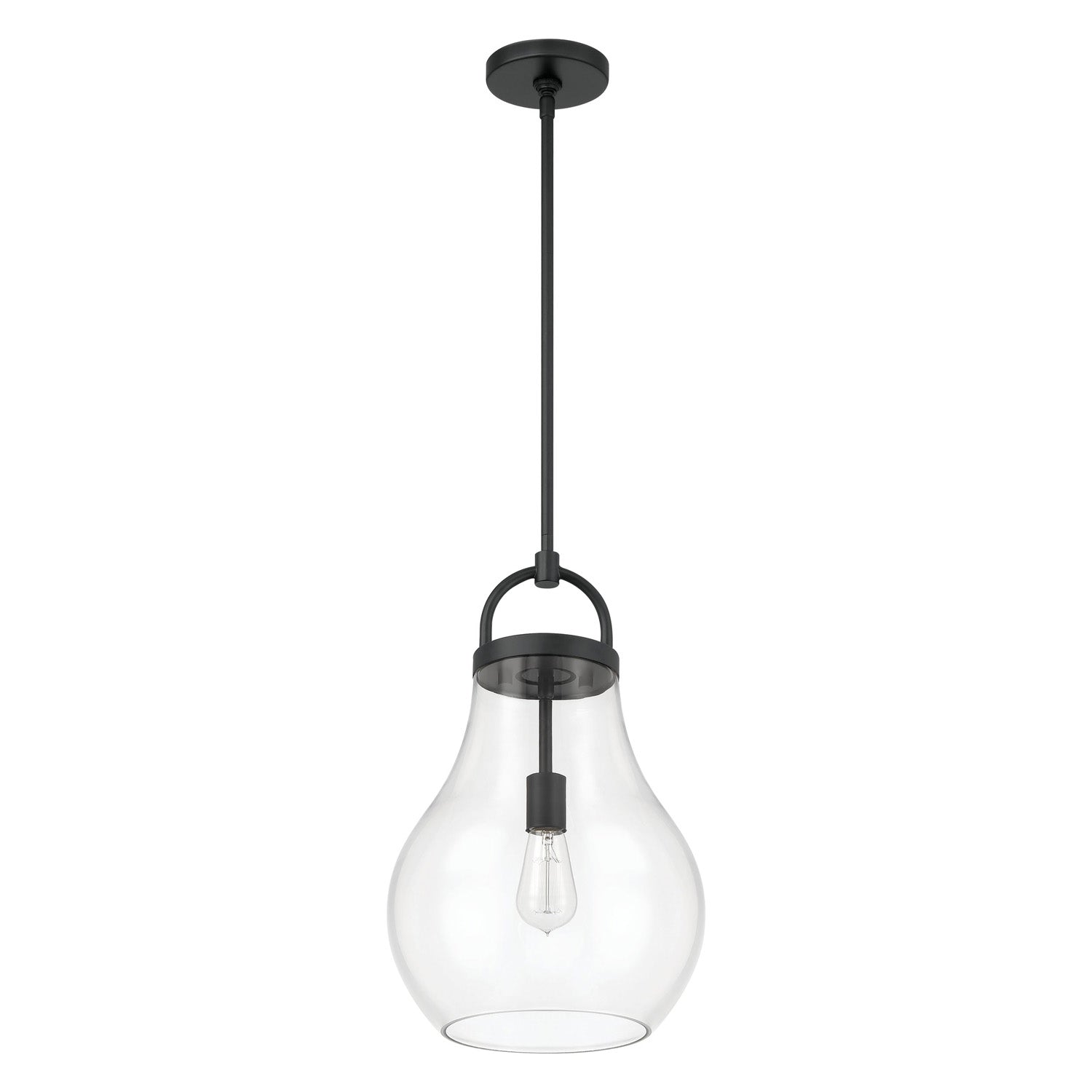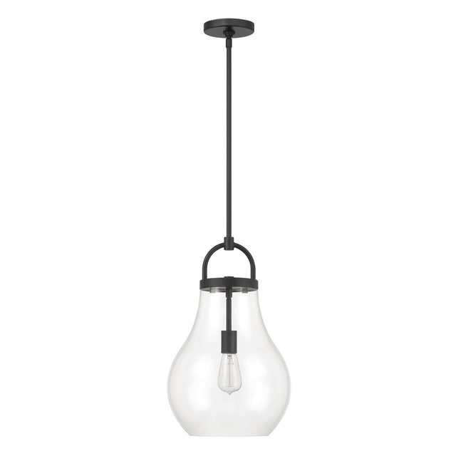 The Naya Medium Pendant 12", Matte Black and Clear Glass brings modern simplicity with an effortless sense of refinement to contemporary interior settings. This fixture is characterized by its distinctive architectural details, featuring an oversized decorative loop that serves as a sophisticated visual anchor for the design. Paired with a softly tapered teardrop clear glass shade, the Naya collection creates a graceful and polished presence that complements a wide array of interior styles. The transparent glass allows for maximum light output, ensuring your space is brilliantly illuminated while adding a touch of understated luxury to your home.