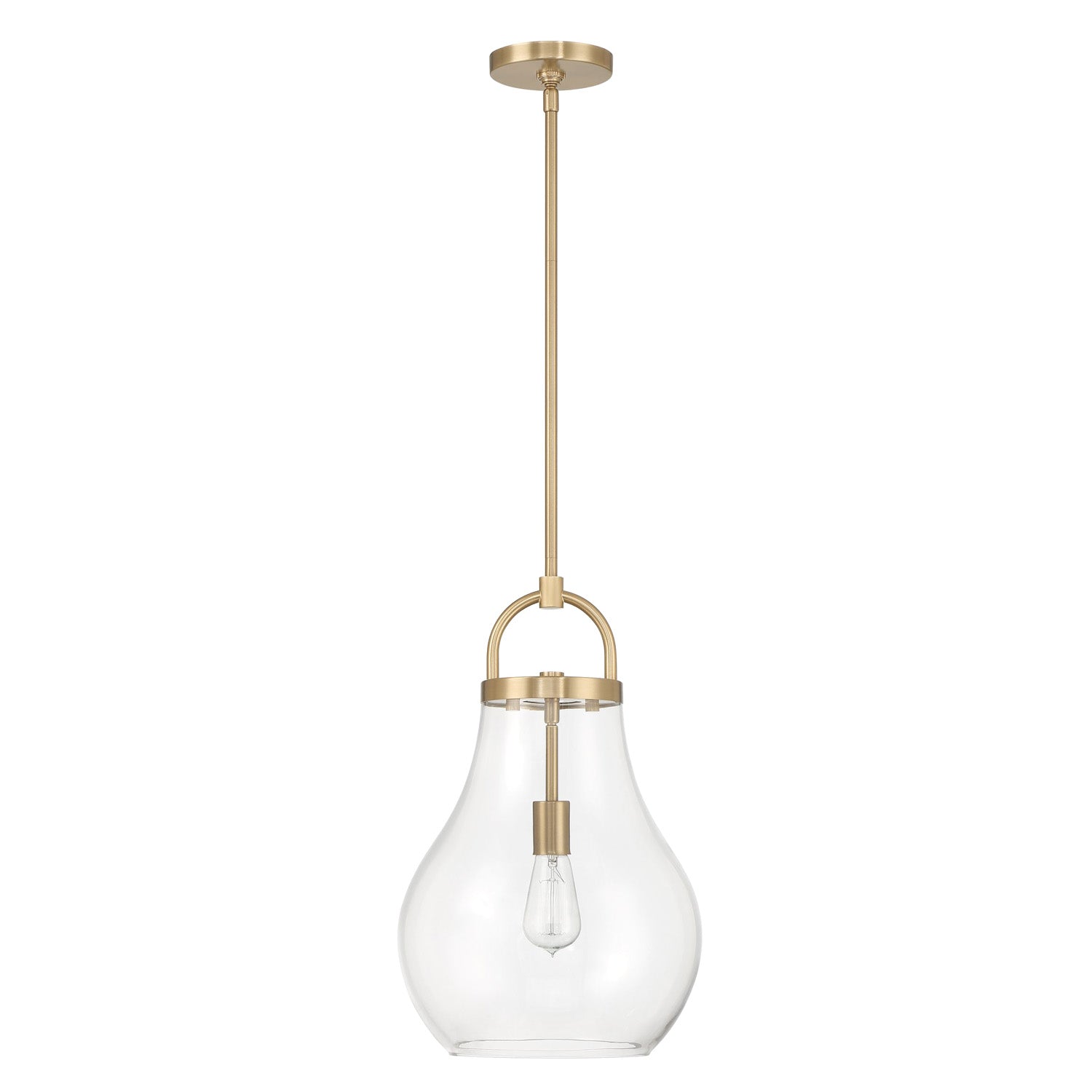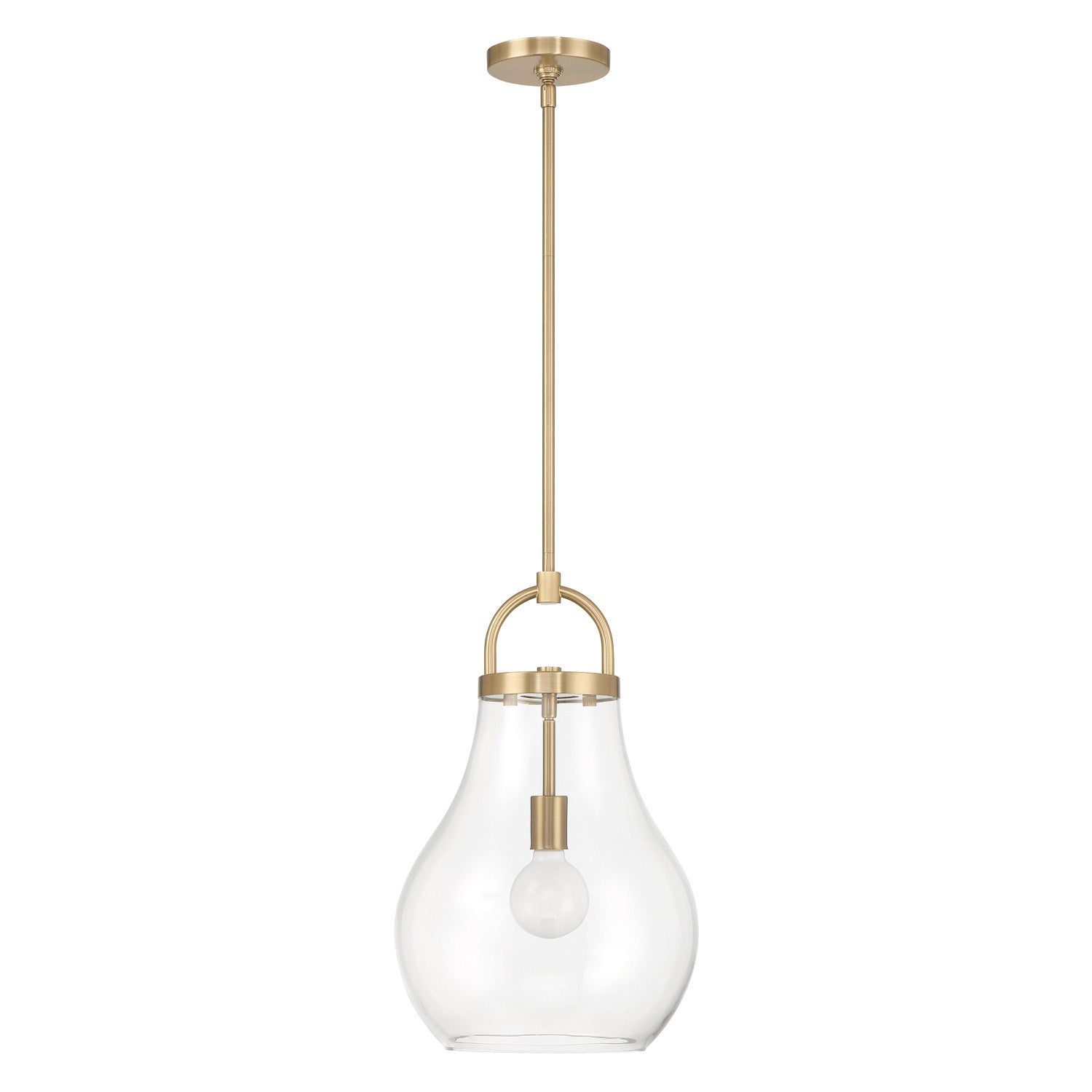 The Naya Medium Pendant 12", Satin Brass and Clear Glass brings modern simplicity with an effortless sense of refinement to contemporary interior settings. This fixture is characterized by its distinctive architectural details, featuring an oversized decorative loop that serves as a sophisticated visual anchor for the design. Paired with a softly tapered teardrop clear glass shade, the Naya collection creates a graceful and polished presence that complements a wide array of interior styles. The transparent glass allows for maximum light output, ensuring your space is brilliantly illuminated while adding a touch of understated luxury to your home.