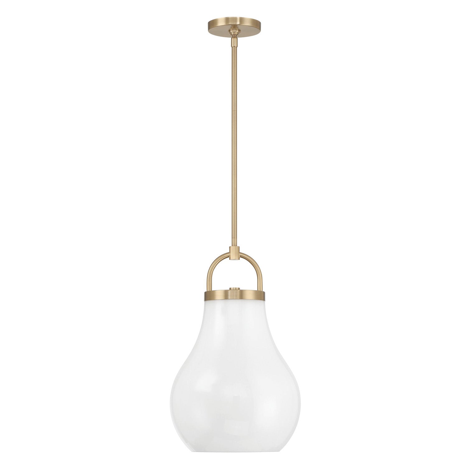 The Naya Medium Pendant 12", Satin Brass and Opal Glass brings modern simplicity with an effortless sense of refinement to contemporary interior settings. This fixture is characterized by its distinctive architectural details, featuring an oversized decorative loop that serves as a sophisticated visual anchor for the design. Paired with a softly tapered teardrop opal glass shade, the Naya collection creates a graceful and polished presence that complements a wide array of interior styles. The opaque glass diffuses light for a soft, uniform glow, ensuring your space is beautifully illuminated while adding a touch of understated luxury to your home.