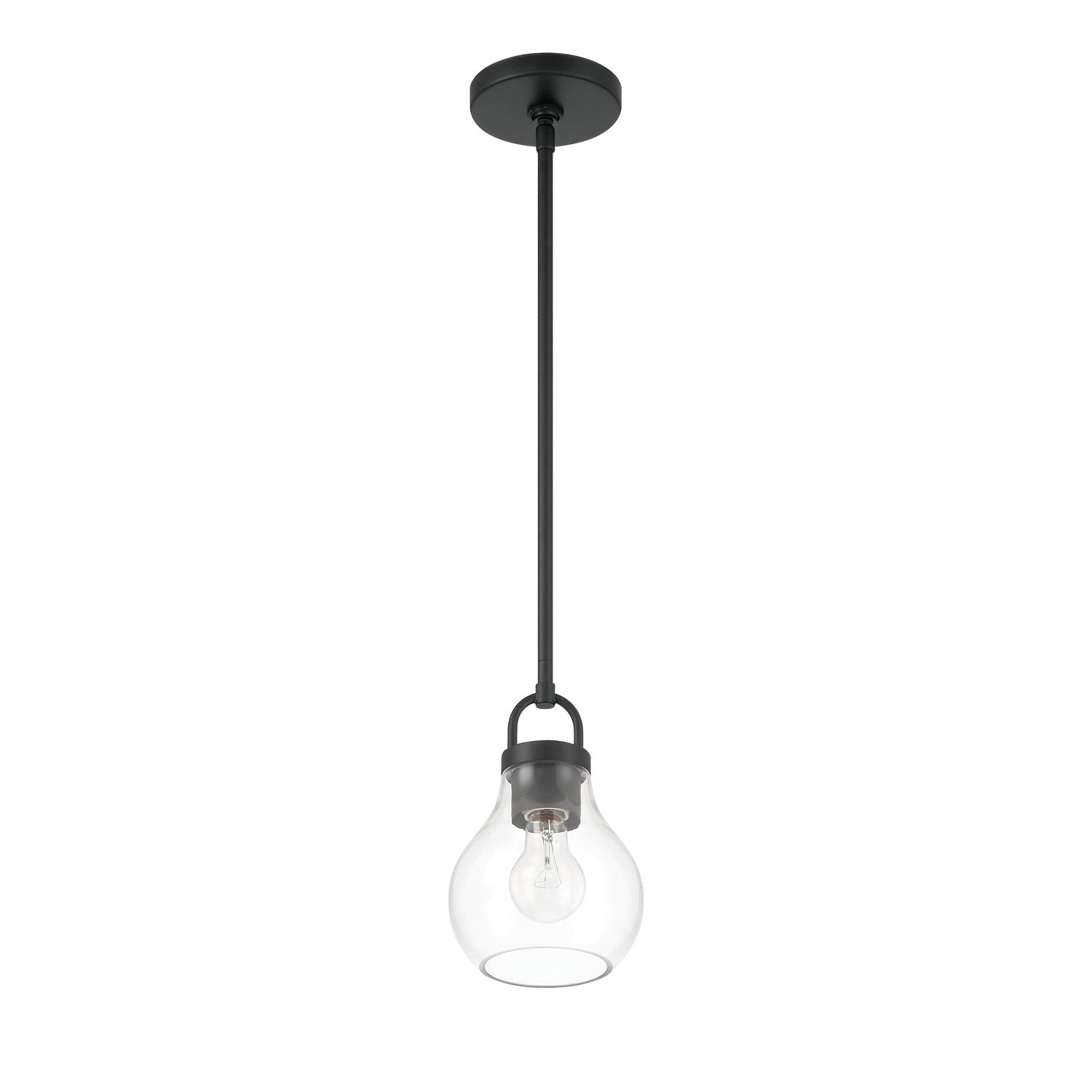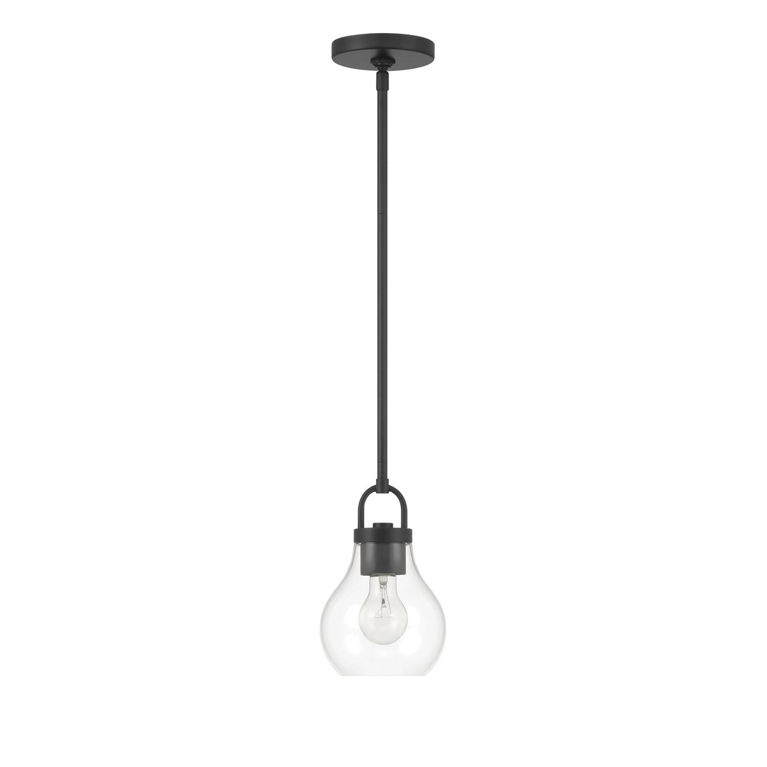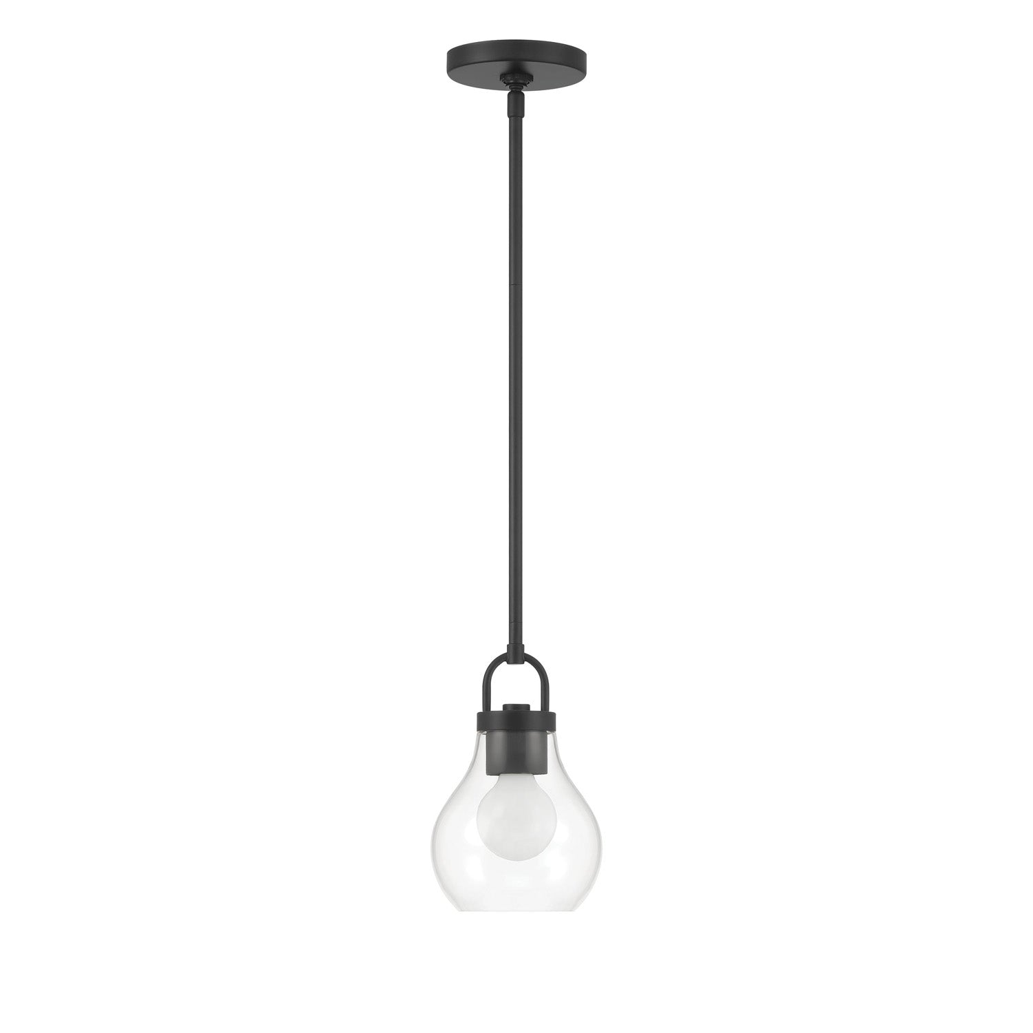 The Naya Small Pendant 6", Matte Black and Clear Glass brings modern simplicity with an effortless sense of refinement to contemporary interior settings. This fixture is characterized by its distinctive architectural details, featuring an oversized decorative loop that serves as a sophisticated visual anchor for the design. Paired with a softly tapered teardrop clear glass shade, the Naya collection creates a graceful and polished presence that complements a wide array of interior styles. The transparent glass allows for maximum light output, ensuring your space is brilliantly illuminated while adding a touch of understated luxury to your home.