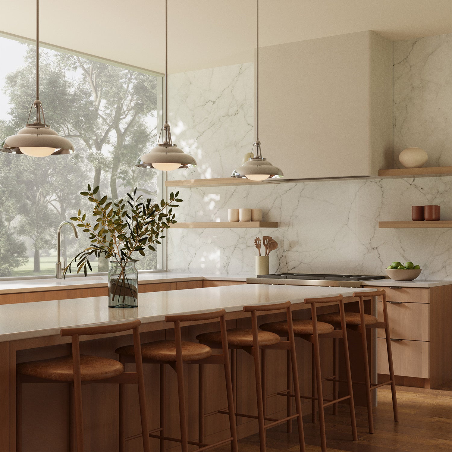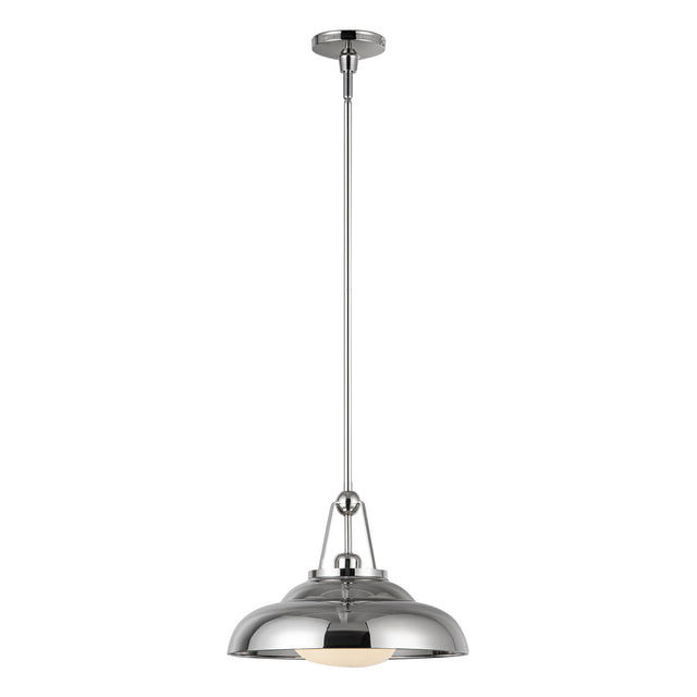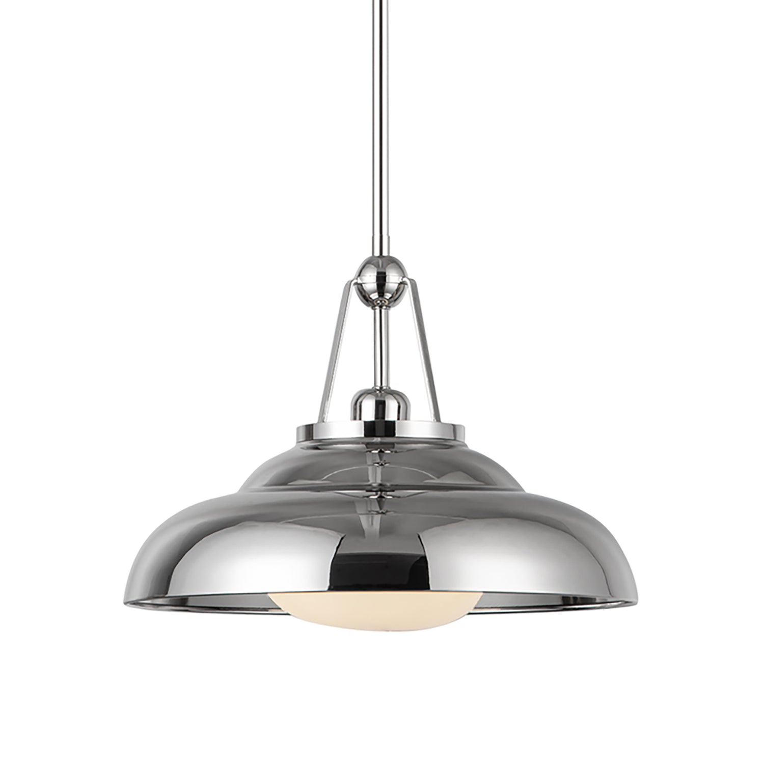 The Neville Pendant features a striking blend of vintage-industrial and modern design elements with a sleek Polished Nickel finish. This versatile ceiling light showcases a wide dome metal shade with a smooth opal glass diffuser that creates soft, glare-free illumination. The industrial-inspired details include decorative ball joints and a sleek silhouette that works beautifully in various interior styles from traditional to contemporary. Measuring 14.5" in diameter, the Neville makes a perfect statement over kitchen islands, dining tables, or in entryways where you want to add a touch of heritage-inspired elegance.