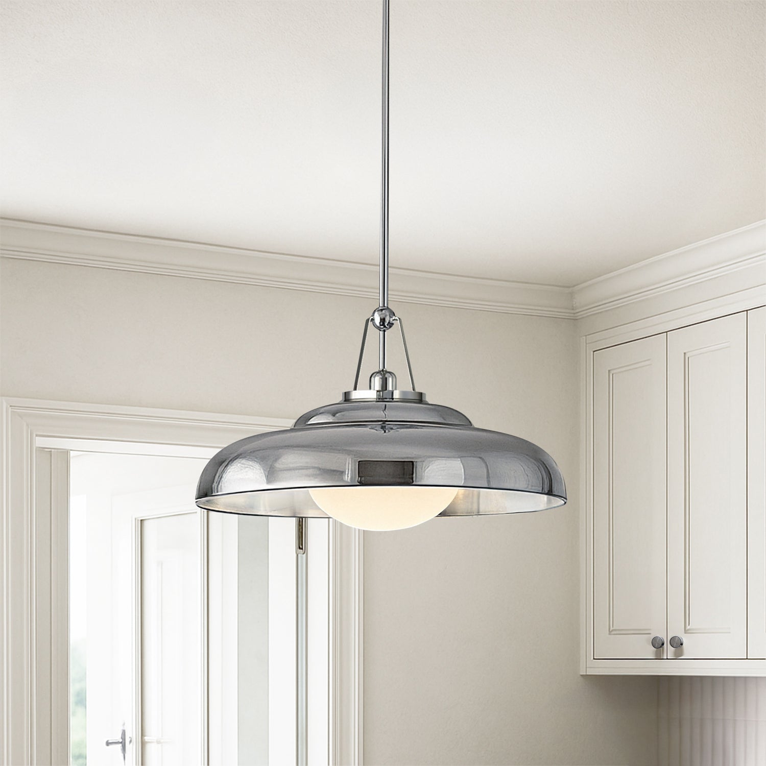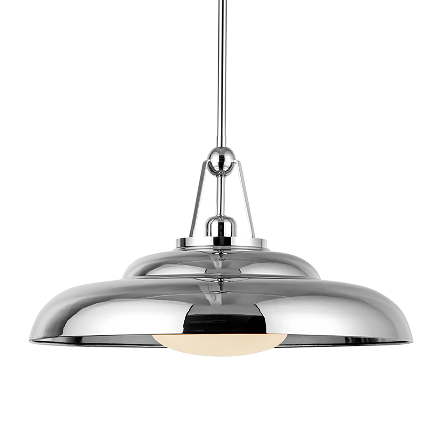• Neville features a highly polished nickel dome shade with a glossy opal glass diffuser, inspired by vintage-industrial ceiling lights