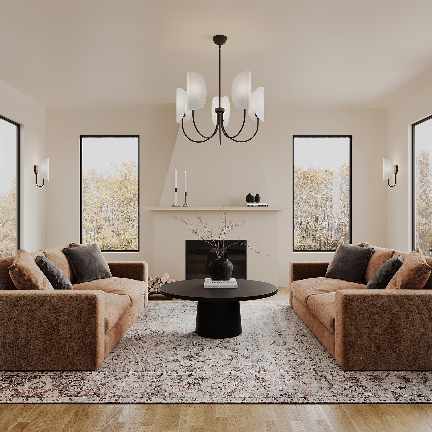 The Nico 5 Light Chandelier features a sculptural design with soft, curved white fabric shades in a sleek Matte Black frame. This elegant ceiling light showcases five petal-like elements arranged around a central column, creating a contemporary silhouette with architectural appeal. The delicate fabric shades softly filter and diffuse light upward and downward, creating a warm, ambient glow in your space. Measuring 32" in diameter, the Nico makes a refined statement over dining tables, kitchen islands, or in entryways. The combination of soft fabric shades and antique brass hardware brings a touch of sophistication to any room, while the unique shade design adds visual interest and modern character.