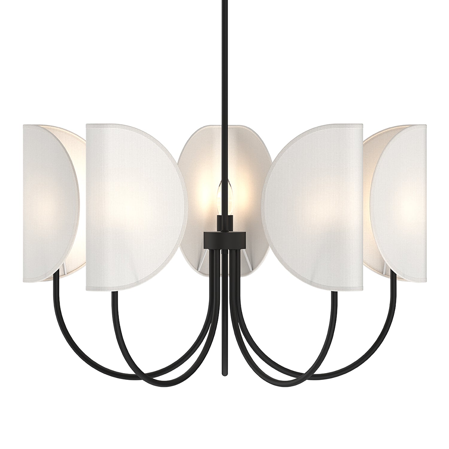• Nico features five curved Matte Black arms, topped with petal-like folded white fabric shades with matching hardware