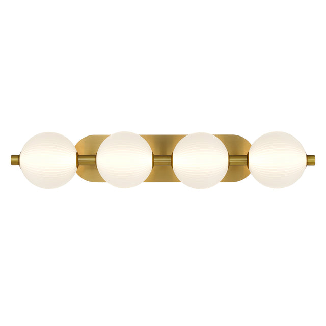 The Nola LED Vanity brings refined sophistication to any bathroom with its distinctive sphere design and warm brass finish. This captivating fixture features four beautifully crafted ribbed opal glass globes that create soft, textured illumination perfect for vanity task lighting and daily routines. The warm brass and ribbed opal glass deliver understated luxury with artisanal character. At 30" wide with integrated LED technology, this vanity light makes an elegant statement while providing decades of energy-efficient operation.