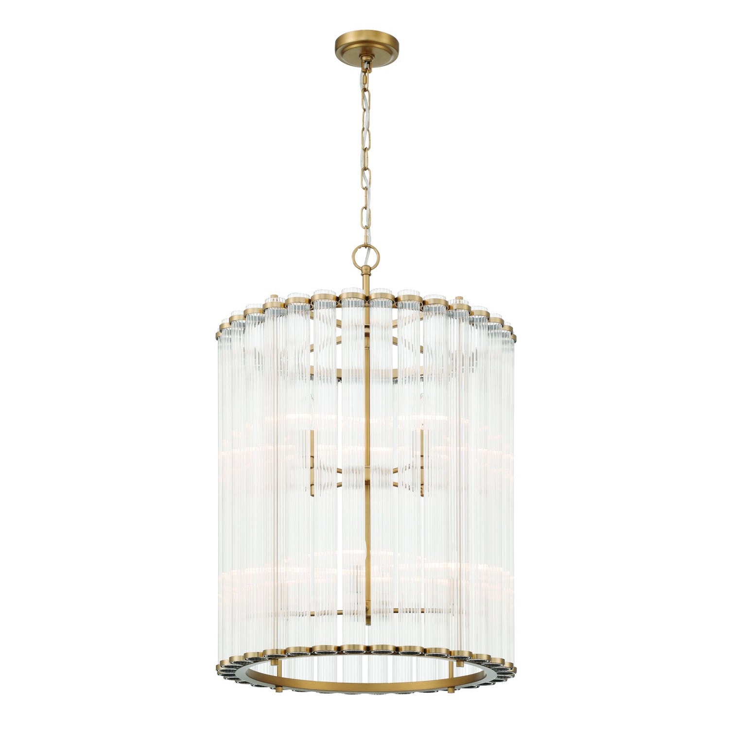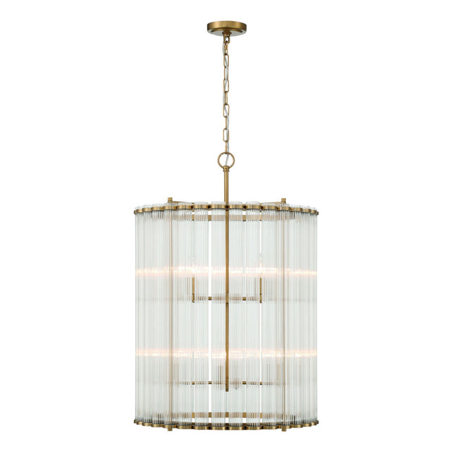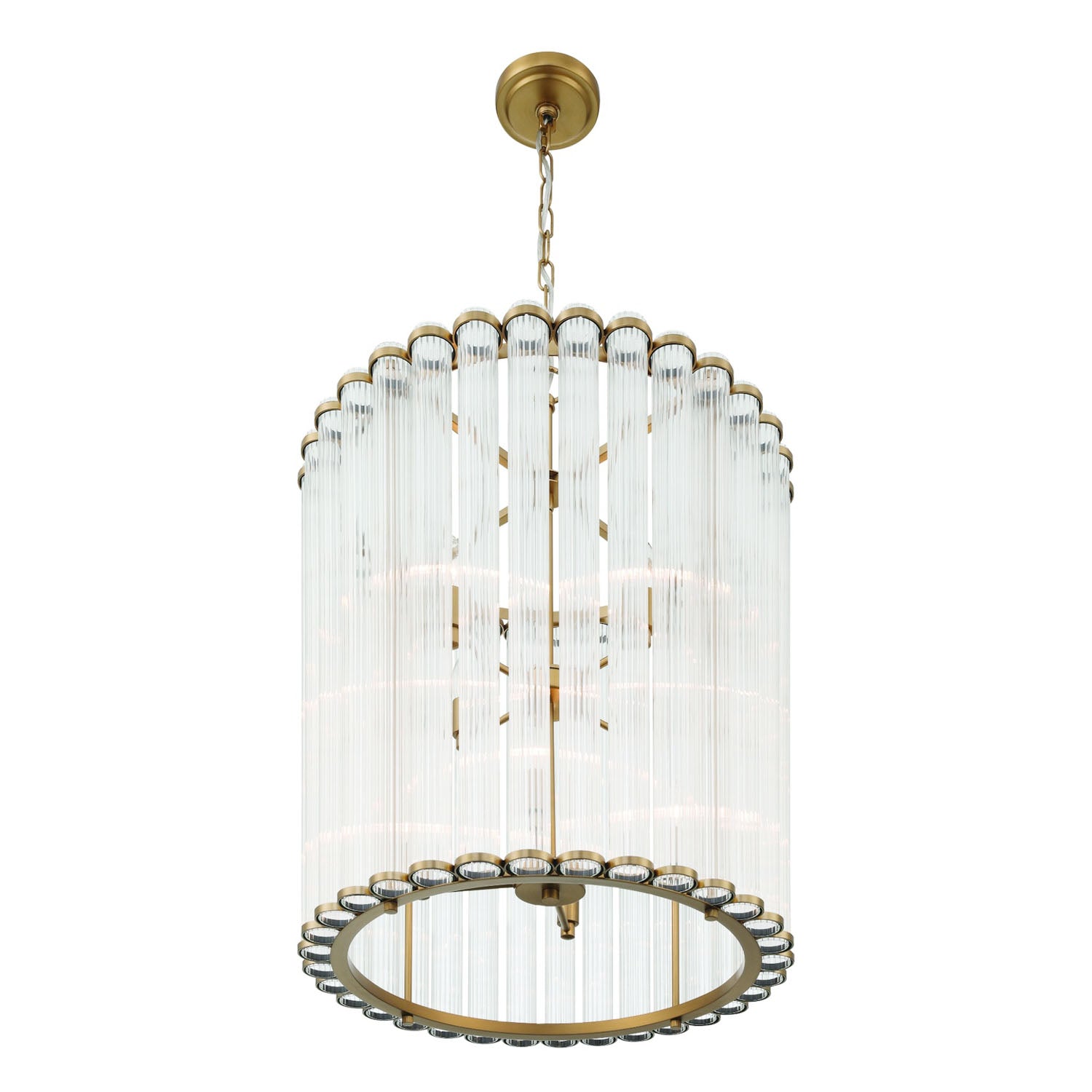 The Nori Chandelier brings transitional elegance to any space with its distinctive design and brass finish. This captivating fixture features beautifully crafted ribbed glass cylinders arranged in a stunning drum formation, creating brilliant, evenly distributed illumination that transforms dining rooms, entryways, and living spaces into sophisticated showcases. The brass metal framework forms elegant round profiles at both the top and bottom of the fixture, while the elongated ribbed glass tubes filter light beautifully throughout the interior space. Brass and ribbed glass elements deliver contemporary luxury with transitional sophistication. At 22" in diameter and 27" tall, this chandelier makes an unforgettable centerpiece that brings elegance and dramatic refinement to any interior.