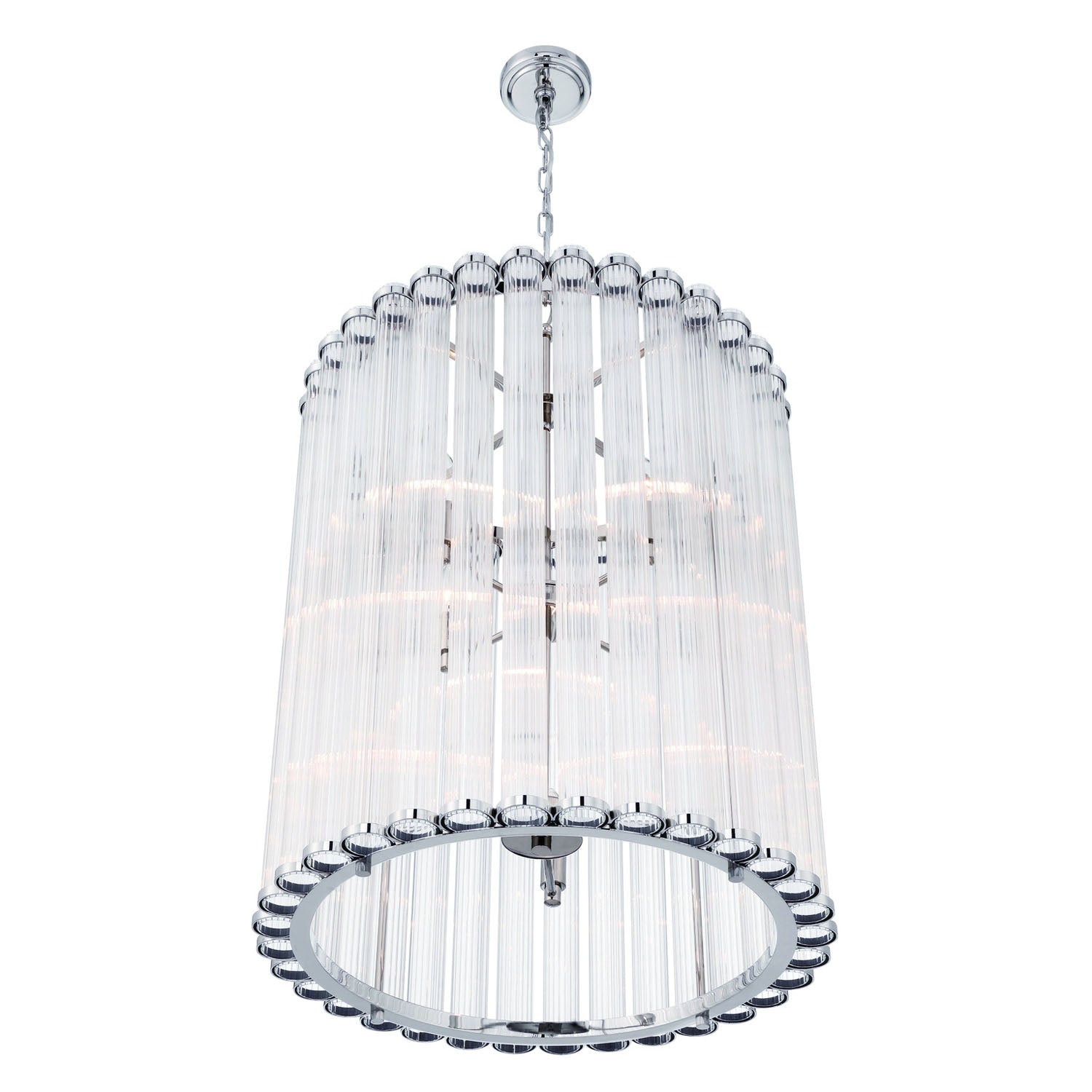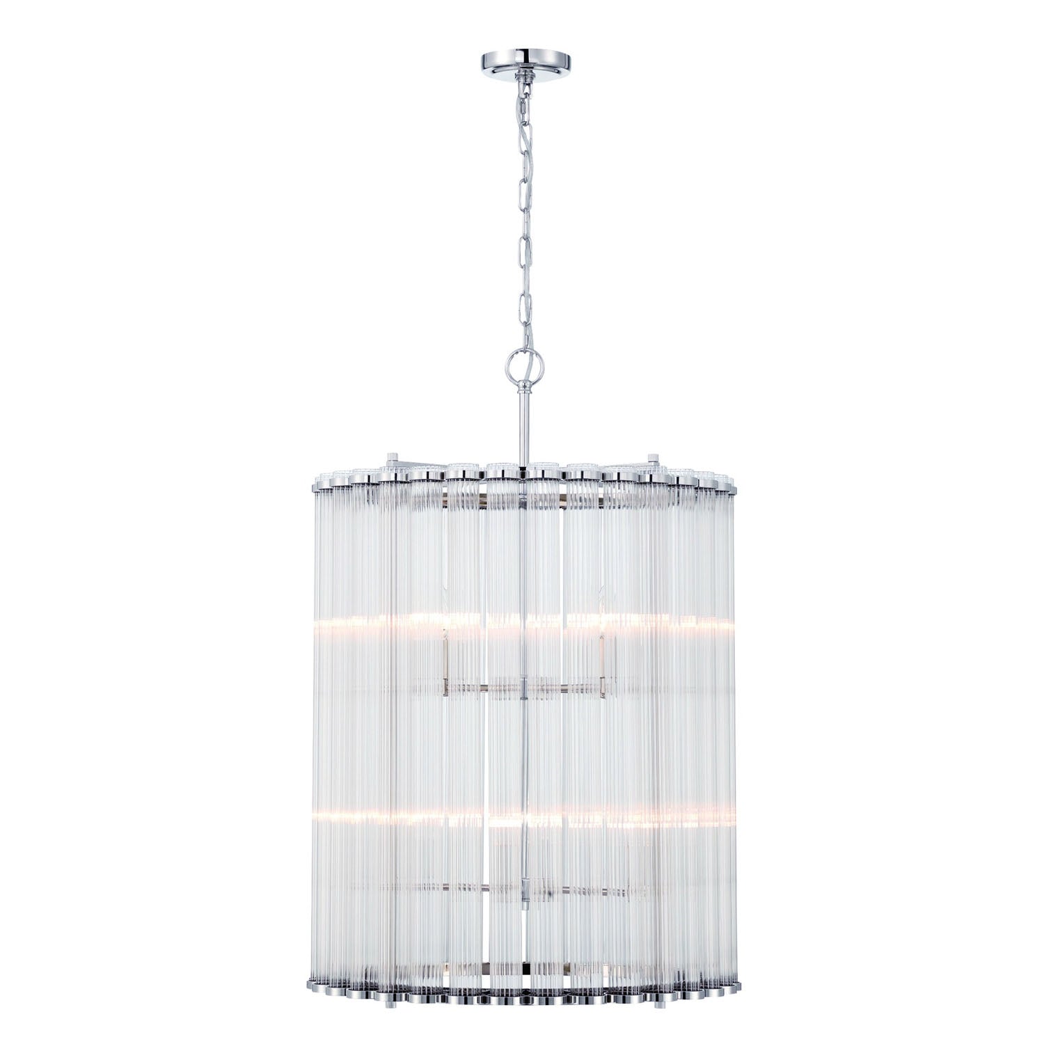 The Nori Chandelier brings transitional elegance to any space with its distinctive design and polished nickel finish. This captivating fixture features beautifully crafted ribbed glass cylinders arranged in a stunning drum formation, creating brilliant, evenly distributed illumination that transforms dining rooms, entryways, and living spaces into sophisticated showcases. The polished nickel framework forms elegant round profiles at both the top and bottom of the fixture, while the elongated ribbed glass tubes filter light beautifully throughout the interior space. The polished nickel and ribbed glass elements deliver contemporary luxury with transitional sophistication. At 22" in diameter and 27" tall, this chandelier makes an unforgettable centerpiece that brings elegance and dramatic refinement to any interior.