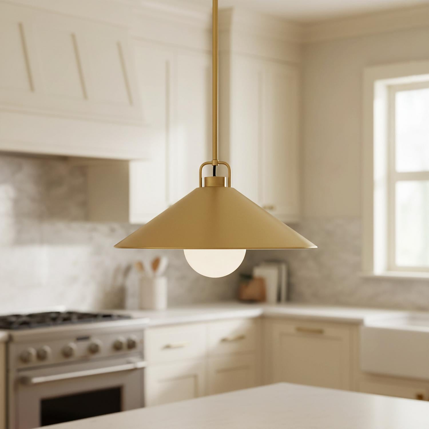 The Nyra Pendant 16" is a modern metal pendant light that makes a sophisticated statement with its sleek, contemporary form and bold, geometric shape. The wide, tapered metal shade directs a powerful, brilliant light downward, making it a highly effective solution for task lighting over a kitchen island or dining table. With its ETL dry rating and sloped ceiling compatibility, it offers both functional beauty and versatile appeal. The sleek Satin Brass finish unifies the entire pendant light, resulting in a look of enduring style and timeless elegance. This striking contemporary light fixture delivers enduring style and a perfect blend of elegance and simplicity.