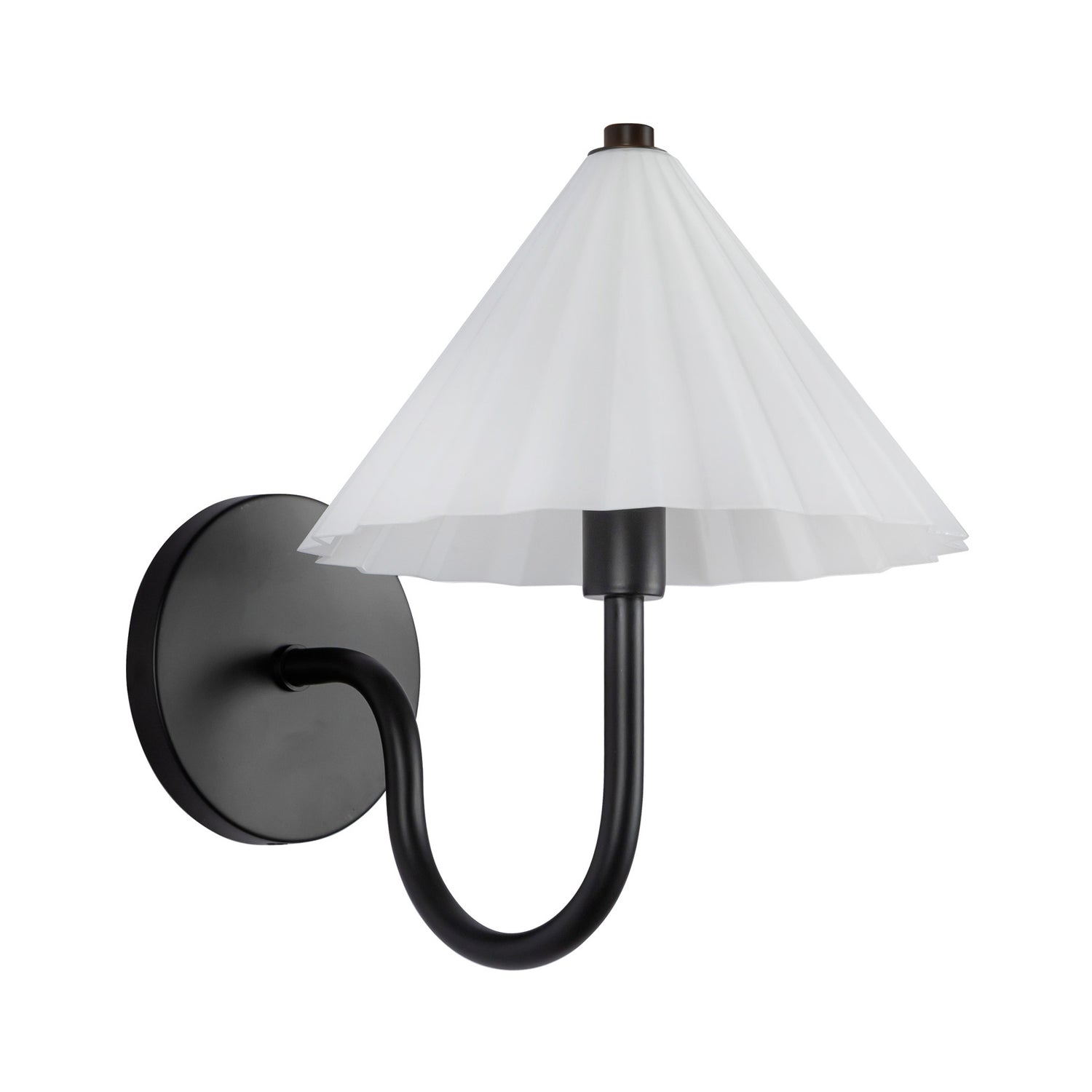 • Reese features a pleated, opal glass conical shade seated atop a curved arm and round backplate, finished in matte black