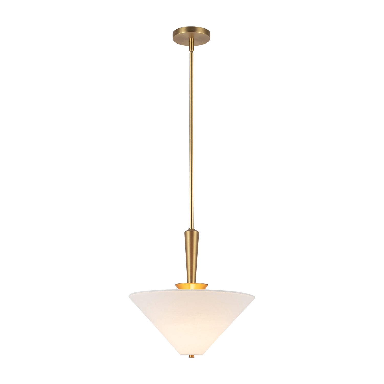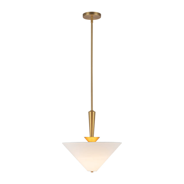 The Sabina Pendant in 16" brings modern style to any space with its distinctive triangular silhouette and warm brushed brass finish. This striking fixture features a white linen shade that creates beautiful ambient lighting while adding contemporary visual interest to dining areas, kitchen islands, and living spaces. The clean-lined design provides graceful presence and architectural appeal, while the white linen shade delivers soft, even illumination with refined textural detail. At 16" in diameter with adjustable hanging height, this pendant combines modern sophistication with creative flair for spaces that demand both style and personality.
