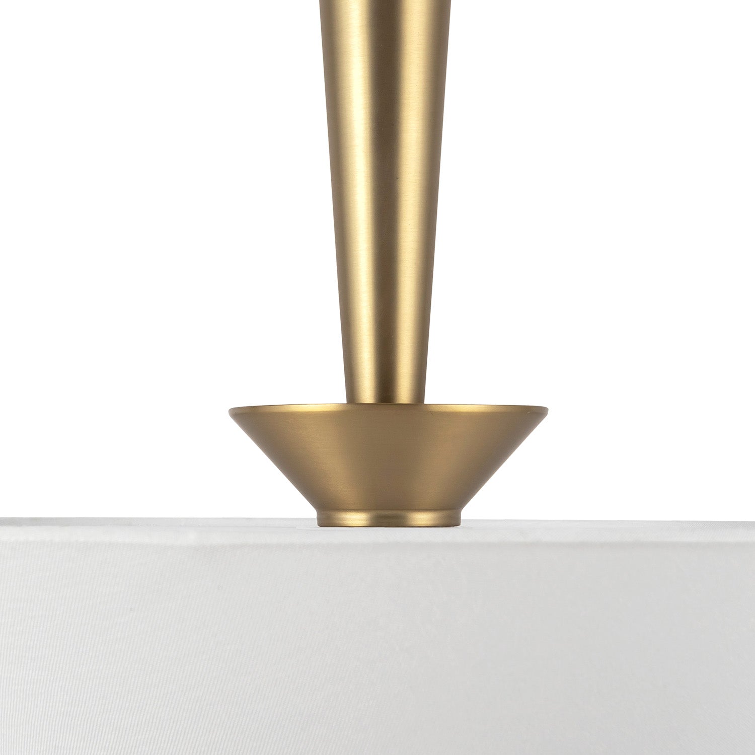 • The Sabina Pendant features an inverted conical design, in brushed brass finish, with a white linen shade