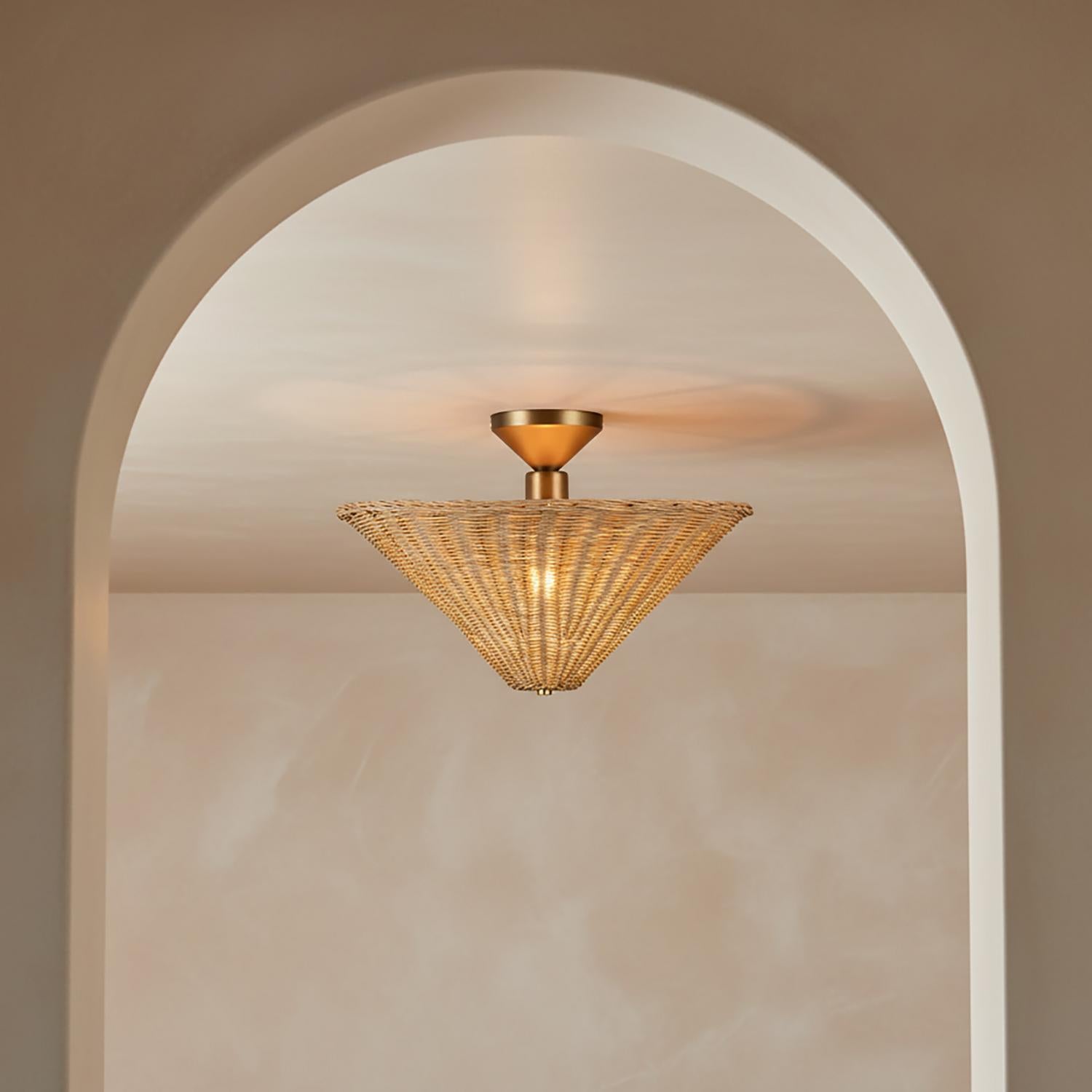 • The Sabina Semi-Flush Mount features an inverted conical design in a brushed brass finish with a natural rattan shade