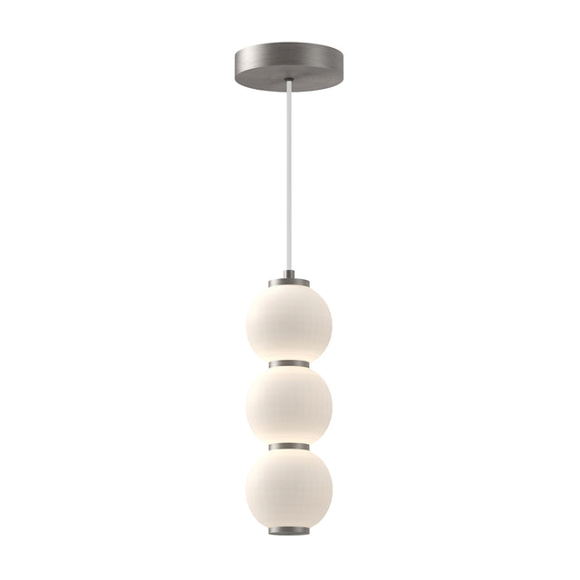 The Shai LED Pendant in 7" brings elegant geometric style to any space with its distinctive stacked sphere design and brushed nickel finish. This striking fixture features three beautifully proportioned opal glass globes that create soft ambient lighting while adding sculptural visual interest to dining areas, kitchen islands, and living spaces. The contemporary design provides clean lines and graceful vertical presence, while the integrated LED technology delivers energy-efficient illumination with warm 3000K color temperature. At 7" in diameter with adjustable hanging height, this pendant makes a refined statement piece that combines simple geometric elements with sophisticated appeal.