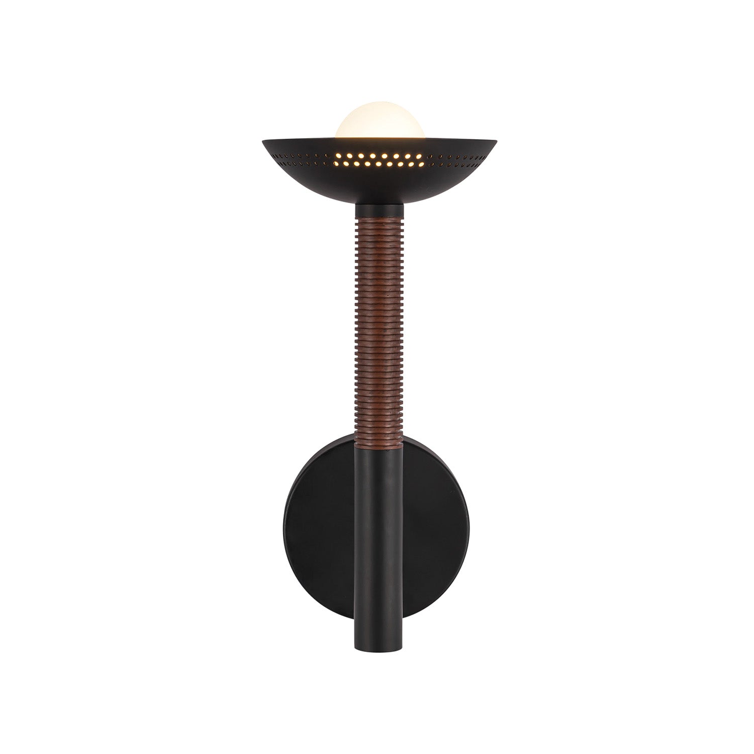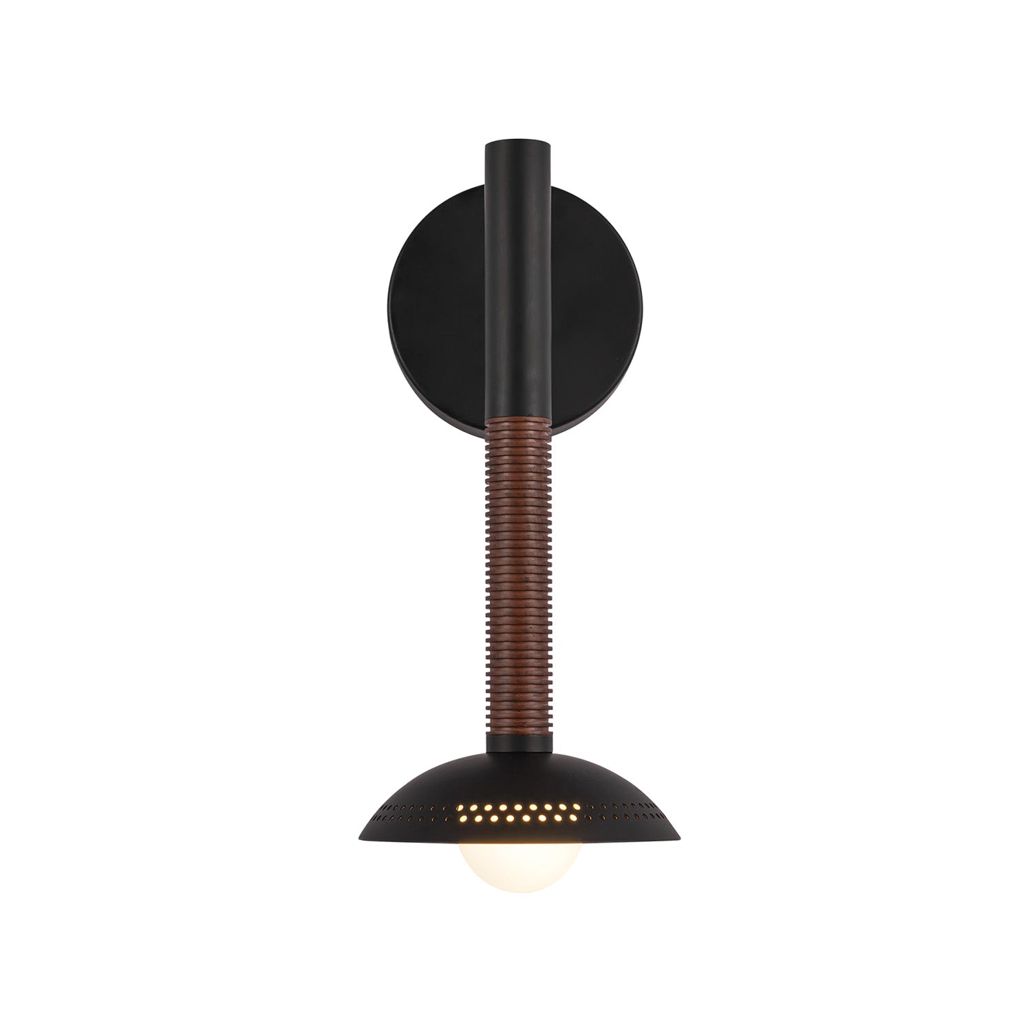 • The Sheila LED Wall Sconce features a linear design with slated walnut veneer details and a perforated dome shade in matte black finish with integrated LED technology