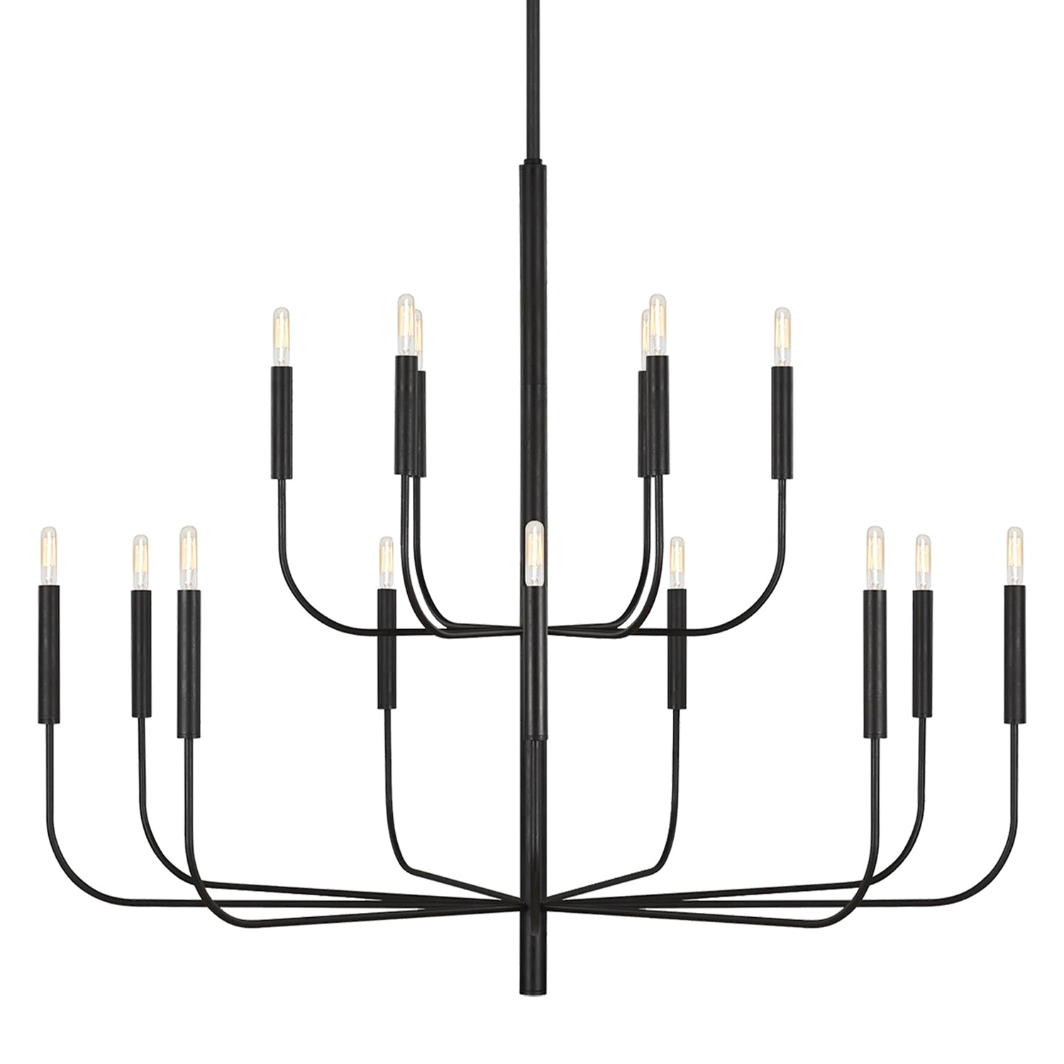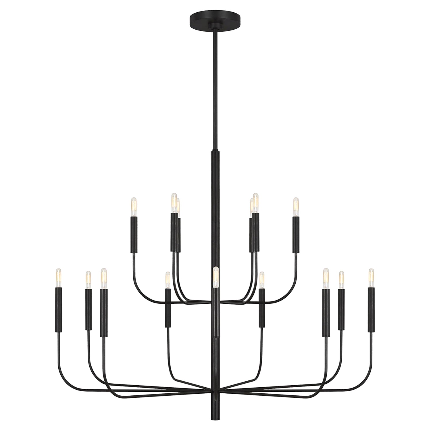 The Thayer 15 Light Two-Tier Chandelier features a dramatic two-tier design that supplies exceptional lighting for your daily needs while adding a layer of style to your home's decor. This grand 49" chandelier showcases graceful, seamless curvature and elongated tubular arms across two tiers that lend fluidity and modern appeal to the classic minimalist silhouette, perfect for great rooms, grand dining rooms, foyers, and areas seeking commanding lighting with contemporary sophistication. The antique iron finish brings rich character while the fifteen-light configuration provides abundant illumination throughout the most expansive spaces. Damp-rated for added versatility, this chandelier delivers both style and functionality for various environments. With its dimmable capabilities and sloped ceiling compatibility, this chandelier transforms any space with distinctive style and performance.