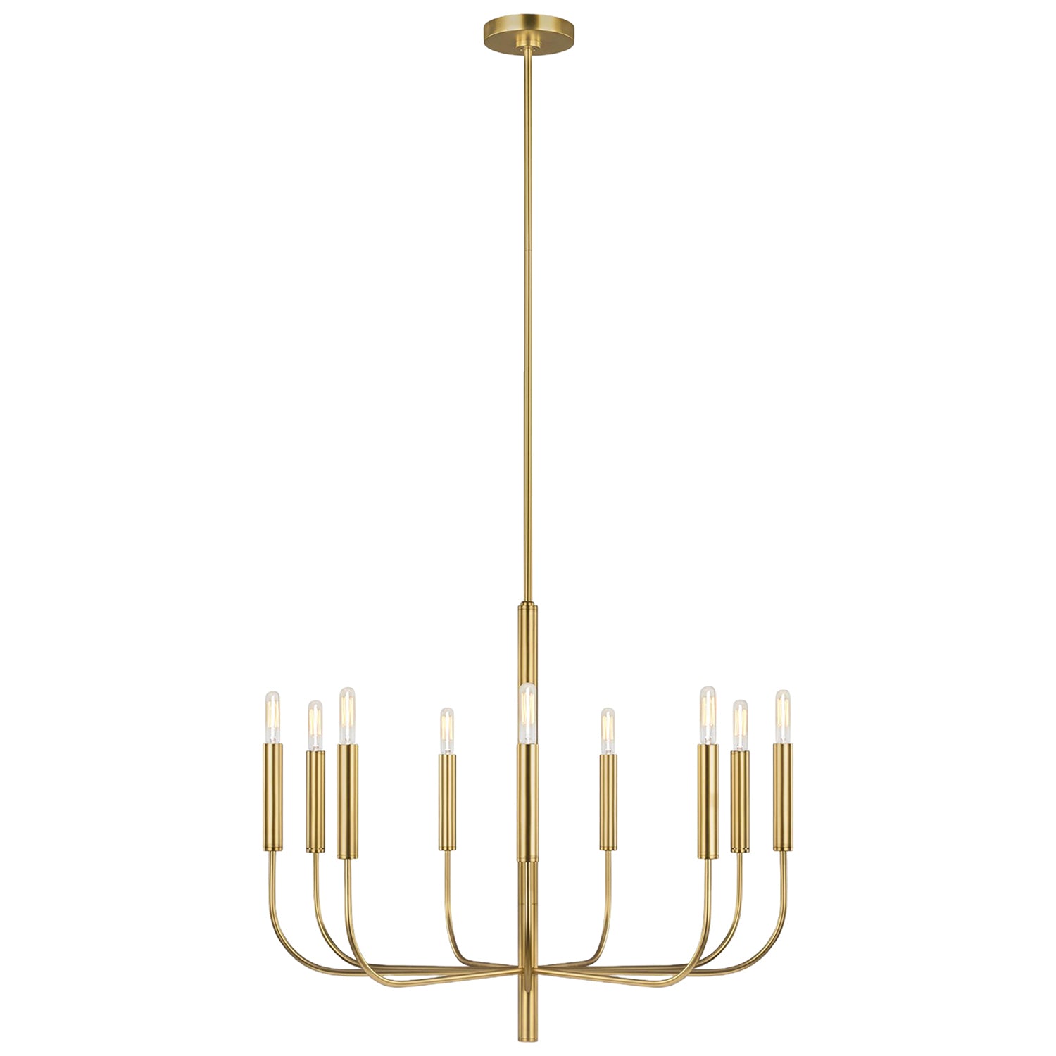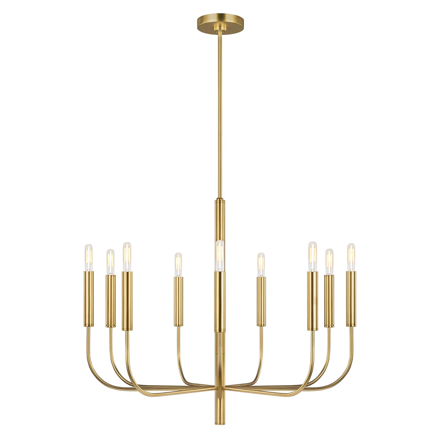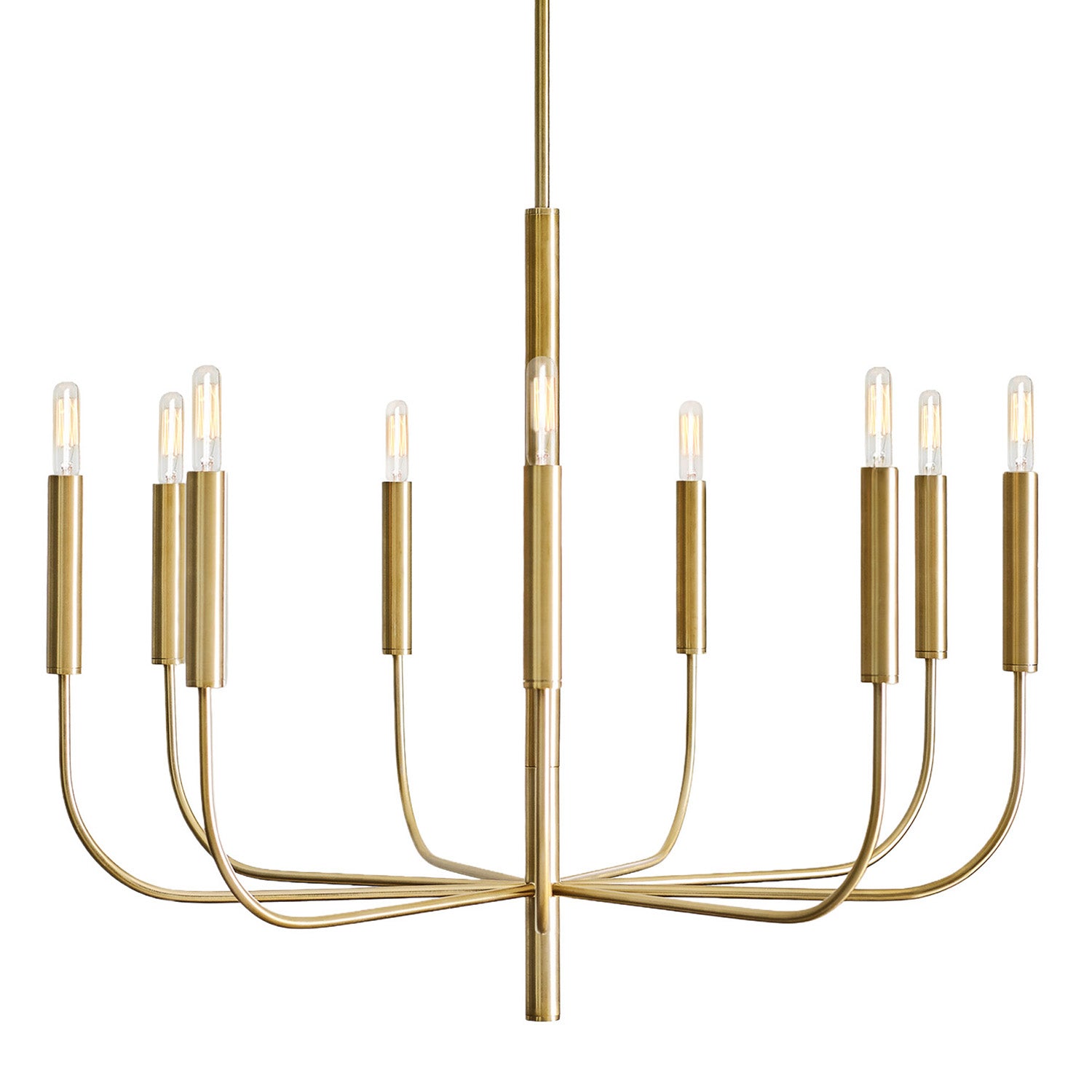 The Thayer 9 Light Chandelier features a single tier design that supplies ample lighting for your daily needs while adding a layer of style to your home's decor. This striking 30" chandelier showcases graceful, seamless curvature and elongated tubular arms that lend fluidity and modern appeal to the classic minimalist silhouette, perfect for large dining rooms, living spaces, and areas seeking substantial lighting with contemporary sophistication. The modern brass finish brings warm elegance while the nine-light configuration provides abundant illumination throughout expansive spaces. Damp-rated for added versatility, this chandelier delivers both style and functionality for various environments. With its dimmable capabilities and sloped ceiling compatibility, this chandelier transforms any space with distinctive style and performance.