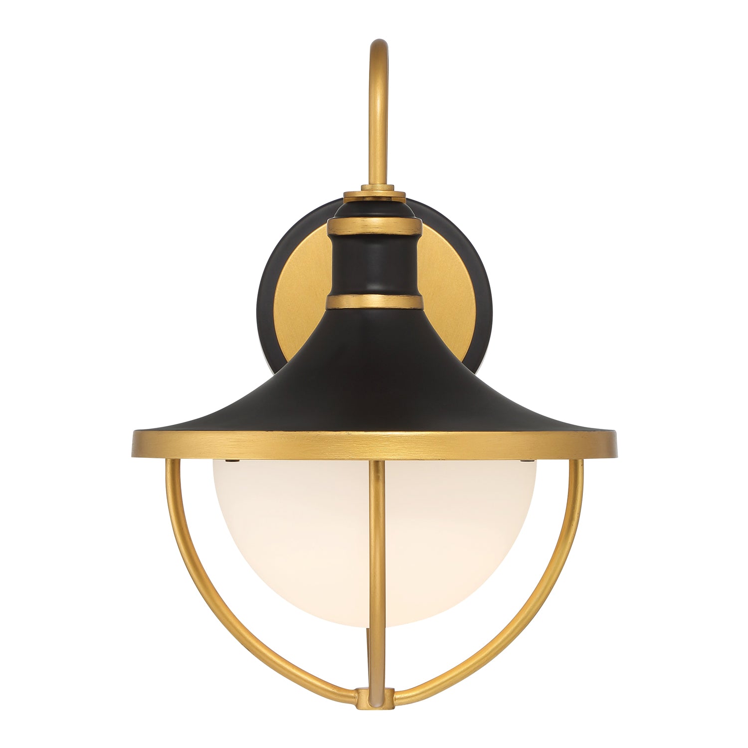 The Tobin Outdoor Wall Light features a modern design with a two-tone finish of Matte Black and Textured Gold. The distinctive silhouette showcases elegant gold arcs that gracefully frame an opal glass bowl, creating a sophisticated lighting element for your home's exterior. This small wall light measures 13.5" tall, making it ideal for entryways, patios, or alongside garage doors. The combination of sleek metal and smooth glass creates a contemporary aesthetic that complements various architectural styles. Weather-resistant and wet-rated for outdoor use, the Tobin provides both functional illumination and decorative appeal.