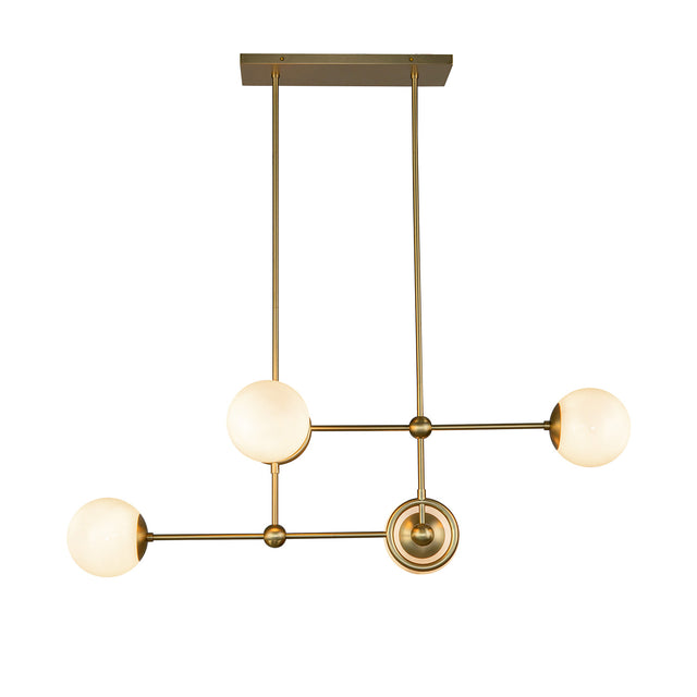 The Tristen 4 Light Chandelier in 42" brings playful mid-century modern style to any space with its distinctive asymmetrical design and warm brushed brass finish. This striking fixture features four opal glass spheres positioned along intersecting arms that create beautiful ambient lighting while adding whimsical visual interest to dining rooms, living areas, and entryways. The contemporary design provides clean lines and captivating presence, while the opal glass globes create a soft interplay of light and shadow reminiscent of 1960s design. At 42" in width with adjustable hanging height, this chandelier makes a statement piece that combines vintage charm with modern appeal for spaces that celebrate both sophistication and playfulness.