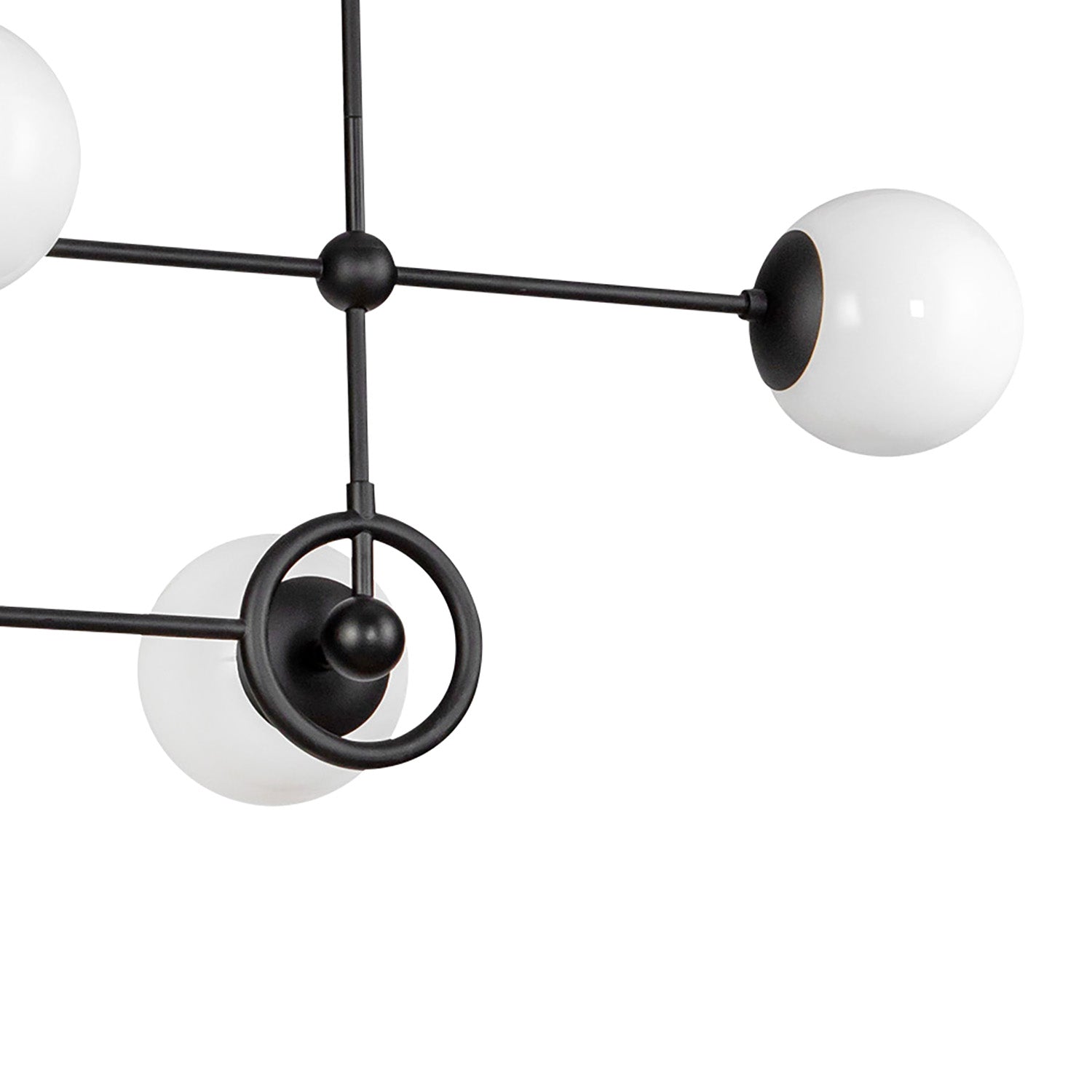 • Tristen Chandelier features an asymmetrical modern design with four opal glass spheres positioned along intersecting arms in a matte black finish