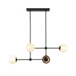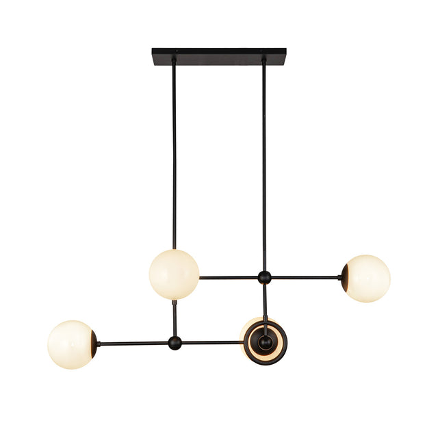 The Tristen 4 Light Chandelier in 42" brings playful mid-century modern style to any space with its distinctive asymmetrical design and sleek matte black finish. This striking fixture features four opal glass spheres positioned along intersecting arms that create beautiful ambient lighting while adding whimsical visual interest to dining rooms, living areas, and entryways. The contemporary design provides clean lines and captivating presence, while the opal glass globes create a soft interplay of light and shadow reminiscent of 1960s design. At 42" in width with adjustable hanging height, this chandelier makes a statement piece that combines vintage charm with modern appeal for spaces that celebrate both sophistication and playfulness.