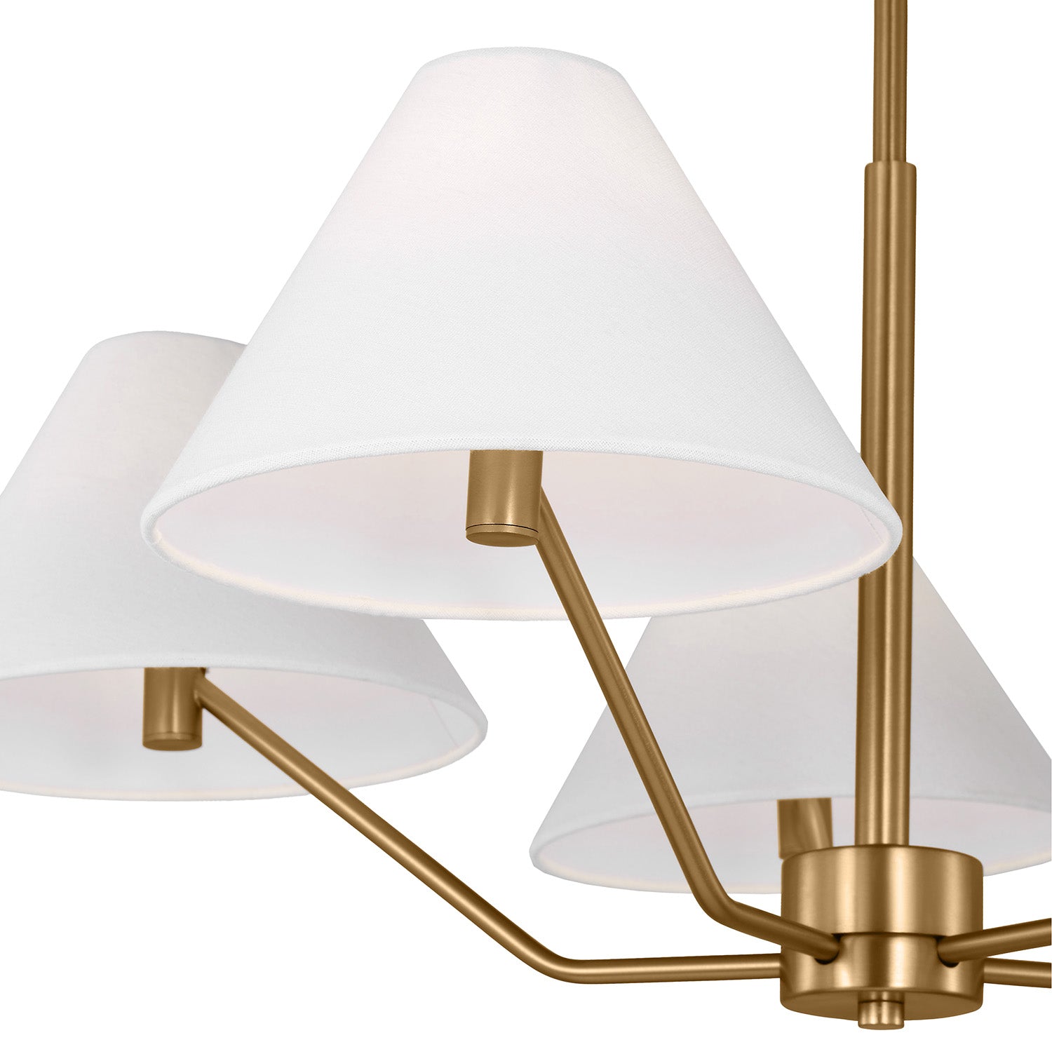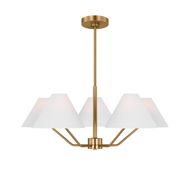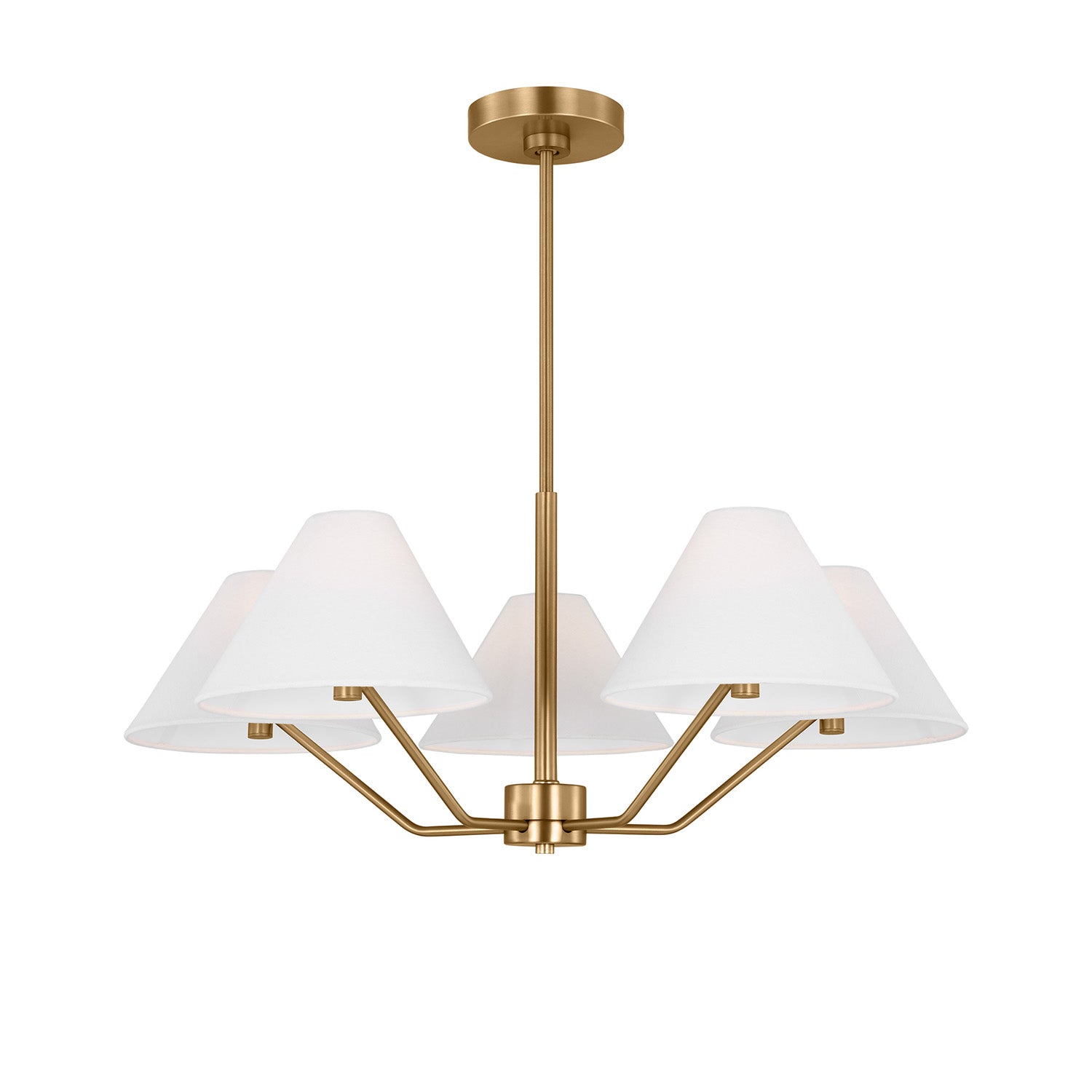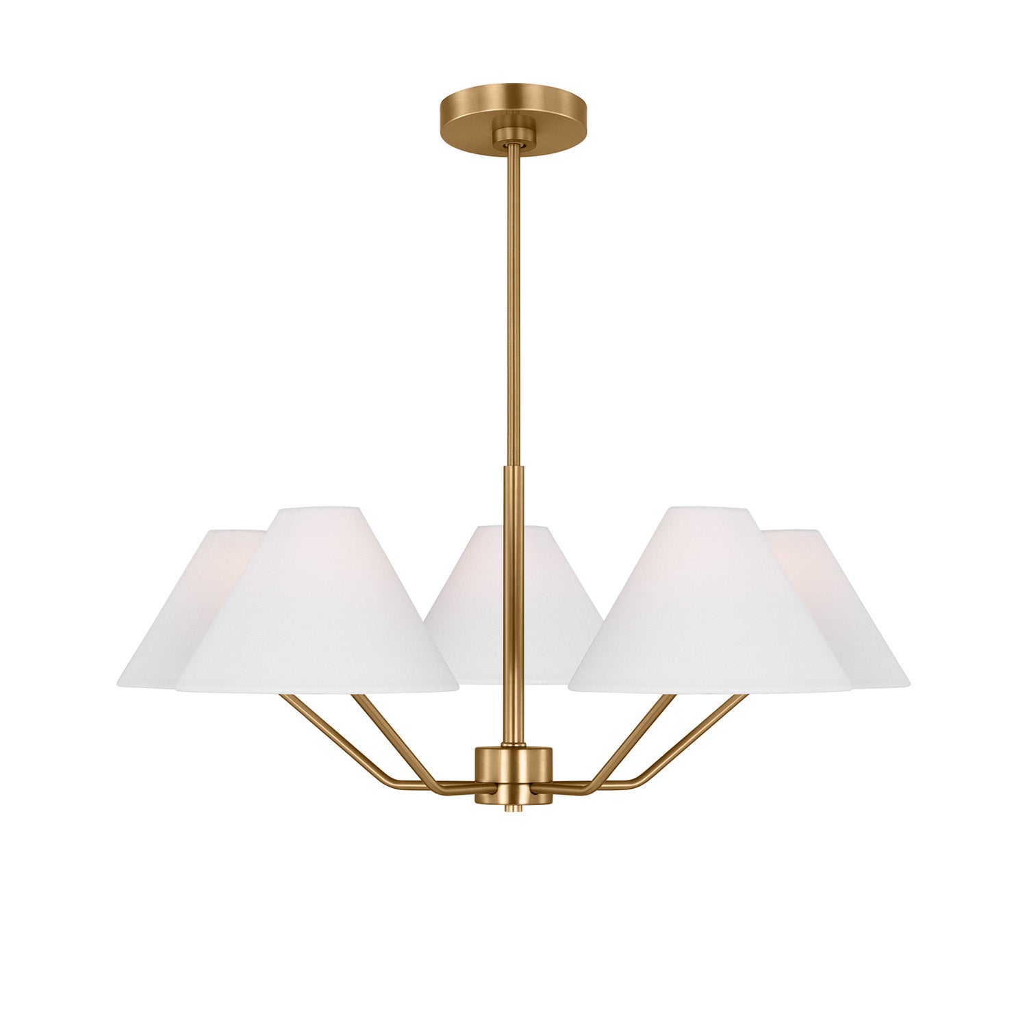 The Wallace 5 Light Chandelier bridges the gap between traditional and modern aesthetics with its structured silhouette featuring gracefully tapered arms that hold white linen empire shades. This elegant 30" chandelier offers a softly diffused glow perfect for dining rooms, living spaces, powder rooms, and areas seeking refined lighting with understated appeal. The satin brass finish brings warm elegance while the white linen shades provide beautiful, even illumination throughout the space. Damp-rated for added versatility, this chandelier delivers both style and functionality for various environments. With its dimmable capabilities and sloped ceiling compatibility, this chandelier transforms any space with distinctive style and performance.