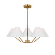• Structured chandelier silhouette with five gracefully tapered arms and white shades bridges traditional and modern aesthetics