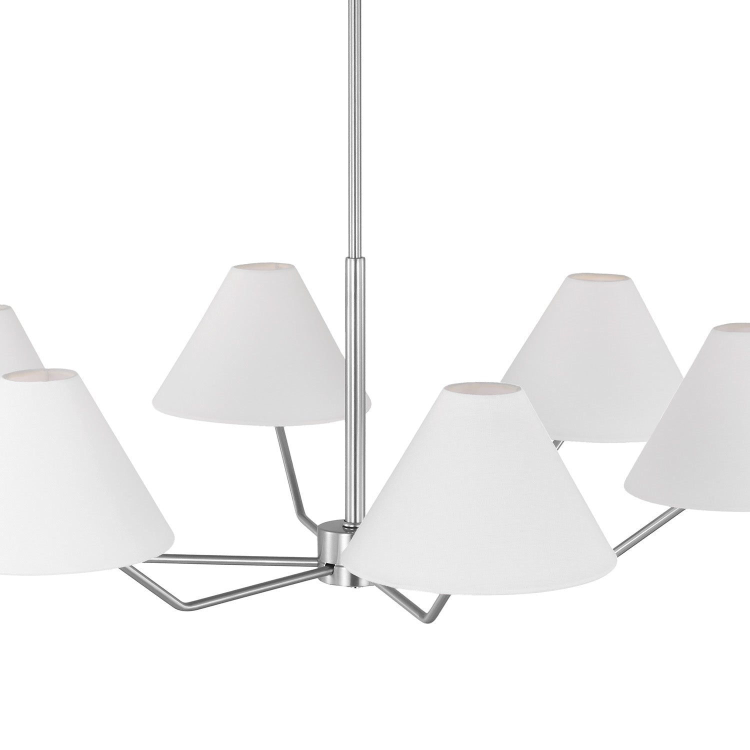The Wallace 6 Light Chandelier bridges the gap between traditional and modern aesthetics with its structured silhouette featuring gracefully tapered arms that hold white linen empire shades. This elegant 38" chandelier offers a softly diffused glow perfect for large dining rooms, living spaces, powder rooms, and areas seeking substantial lighting with understated appeal. The brushed nickel finish brings clean elegance while the white linen shades provide beautiful, even illumination throughout the space. Damp-rated for added versatility, this chandelier delivers both style and functionality for various environments. With its dimmable capabilities and sloped ceiling compatibility, this chandelier transforms any space with distinctive style and performance.