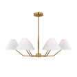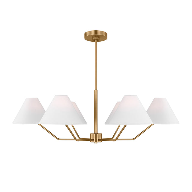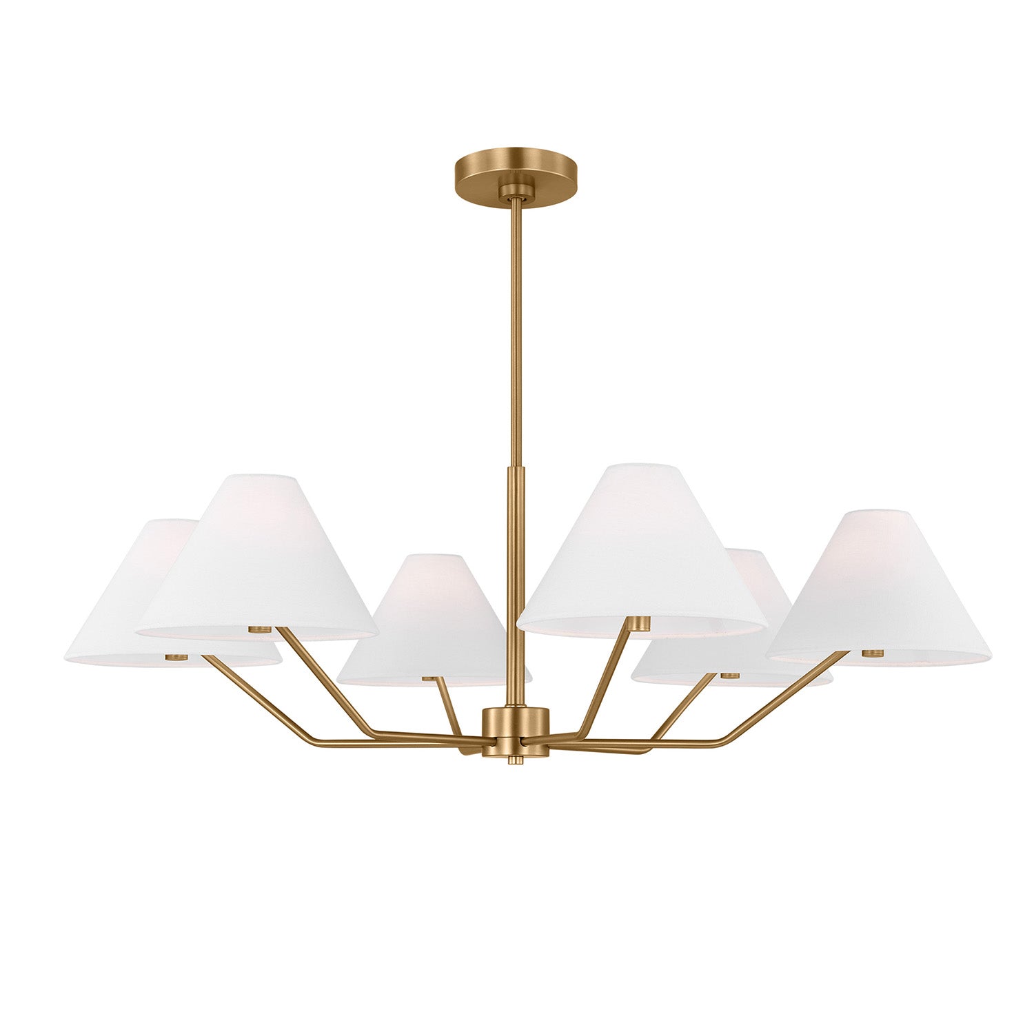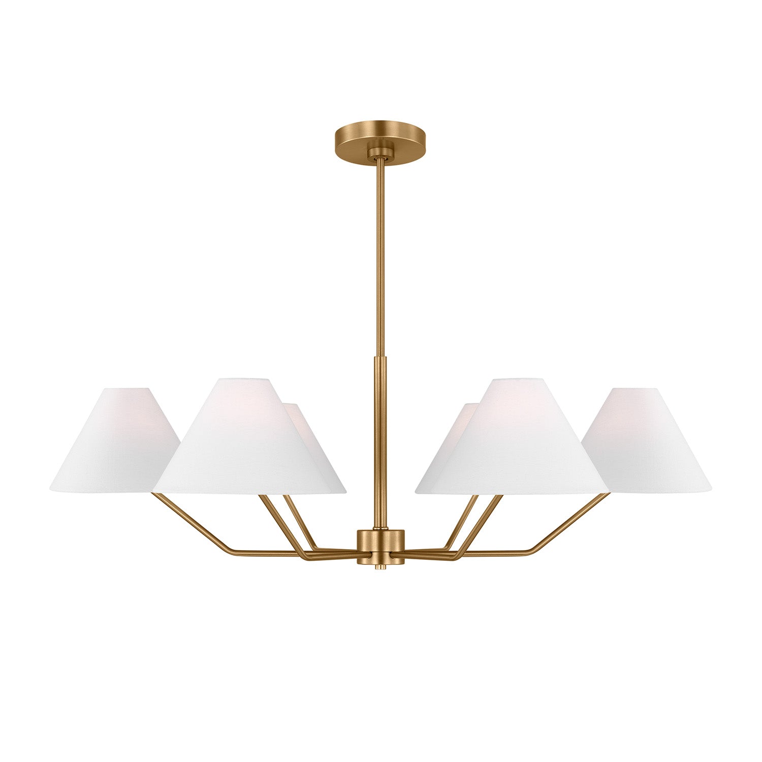 The Wallace 6 Light Chandelier bridges the gap between traditional and modern aesthetics with its structured silhouette featuring gracefully tapered arms that hold white linen empire shades. This elegant 38" chandelier offers a softly diffused glow perfect for large dining rooms, living spaces, powder rooms, and areas seeking substantial lighting with understated appeal. The satin brass finish brings warm elegance while the white linen shades provide beautiful, even illumination throughout the space. Damp-rated for added versatility, this chandelier delivers both style and functionality for various environments. With its dimmable capabilities and sloped ceiling compatibility, this chandelier transforms any space with distinctive style and performance.