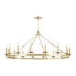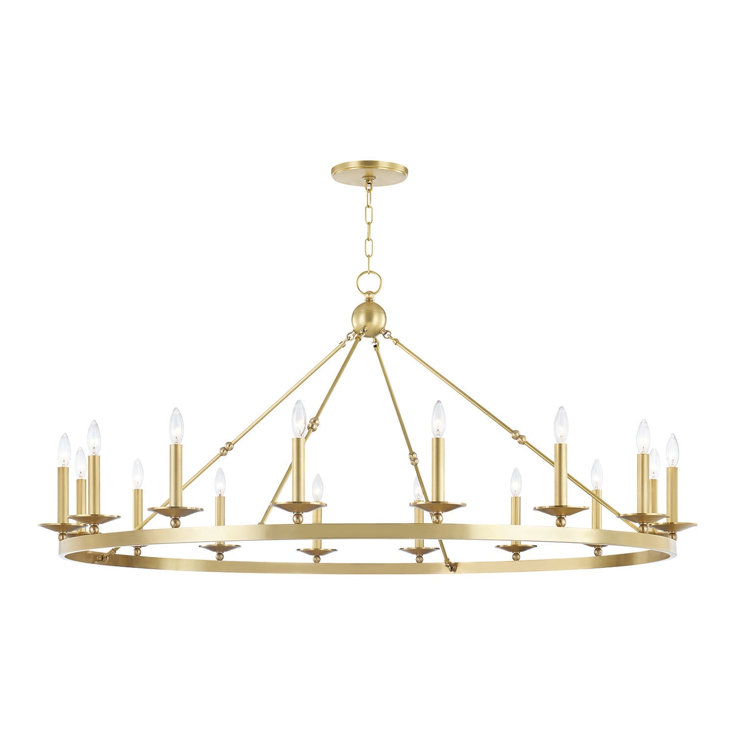 The William 16 Light Ring Chandelier is a classic statement Ring Chandelier that makes a sophisticated impression with its timeless, sweeping rings and expansive scale. The fixture features 16 exposed candelabra lights mounted atop a single, extensive ring, creating a dramatic, symmetrical ambient glow. This extra-large Ring Chandelier is thoughtfully designed as an impressive centerpiece for a grand living space or two-story foyer. With its UL damp rating, it offers both functional beauty and versatile appeal. The rich Aged Brass finish enhances the fixture's clean silhouette, delivering enduring style and a perfect blend of elegance and simplicity.