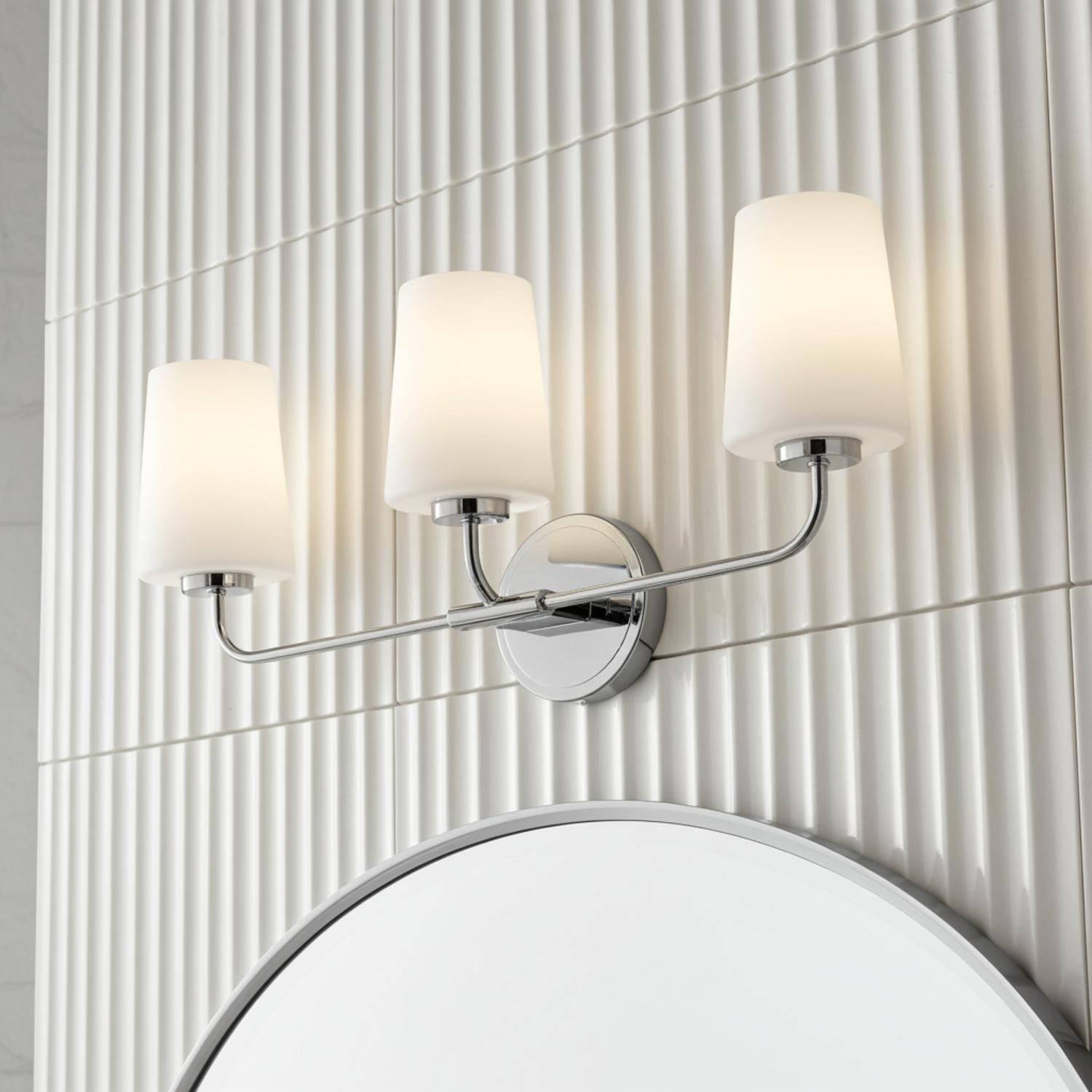 The Wyatt 3 Light Vanity makes a sophisticated statement, defined by its elegant contrast and minimalist style. This fixture features clean, horizontal lines with three gently curved arms, each supporting a bell-shaped milk glass shade that provides a soft, inviting glow. This light is thoughtfully designed to provide expansive, multi-directional illumination, making it ideal for a larger bathroom or powder room. With its ETL damp rating, it offers both functional beauty and versatile appeal. The chrome finish creates a striking contrast with the opaque milk glass shades, resulting in a refined and timeless look. This striking collection delivers enduring style and a perfect blend of elegance and simplicity.