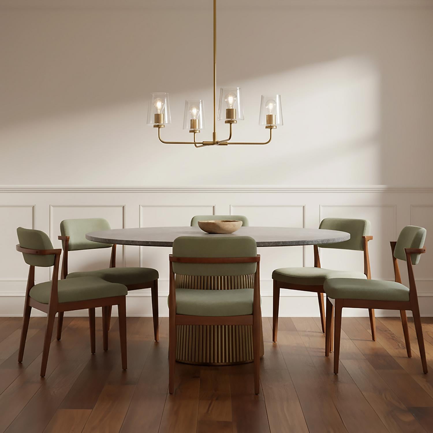 • Four-light chandelier featuring clean, minimalist arms and clear glass shades