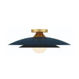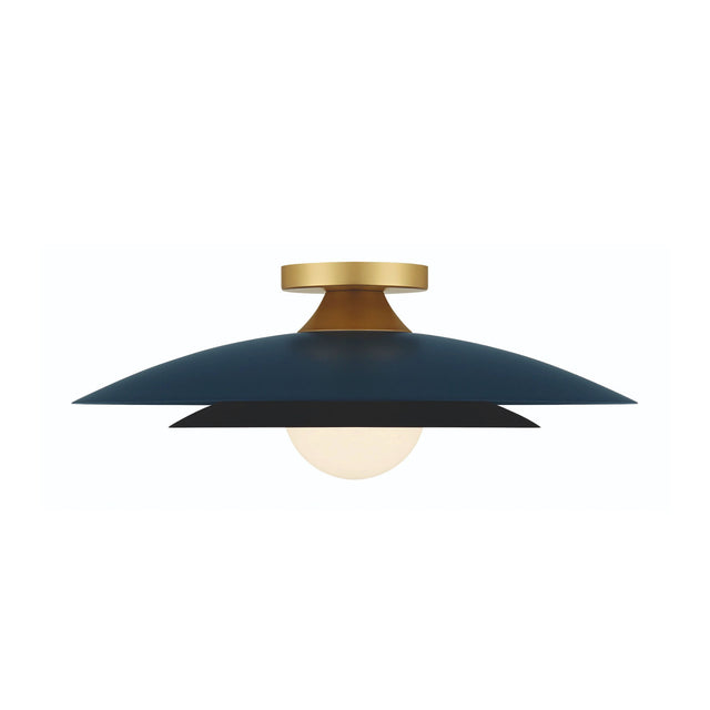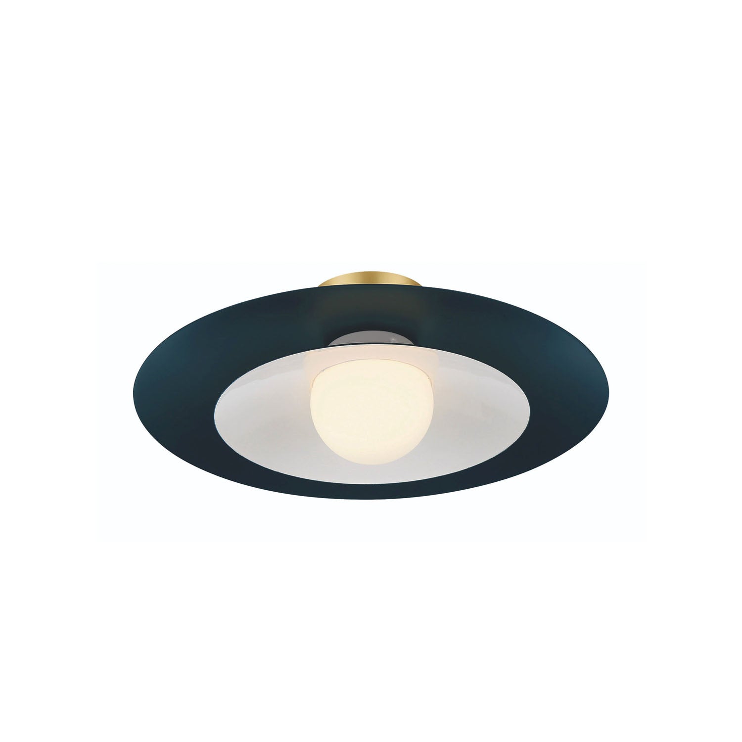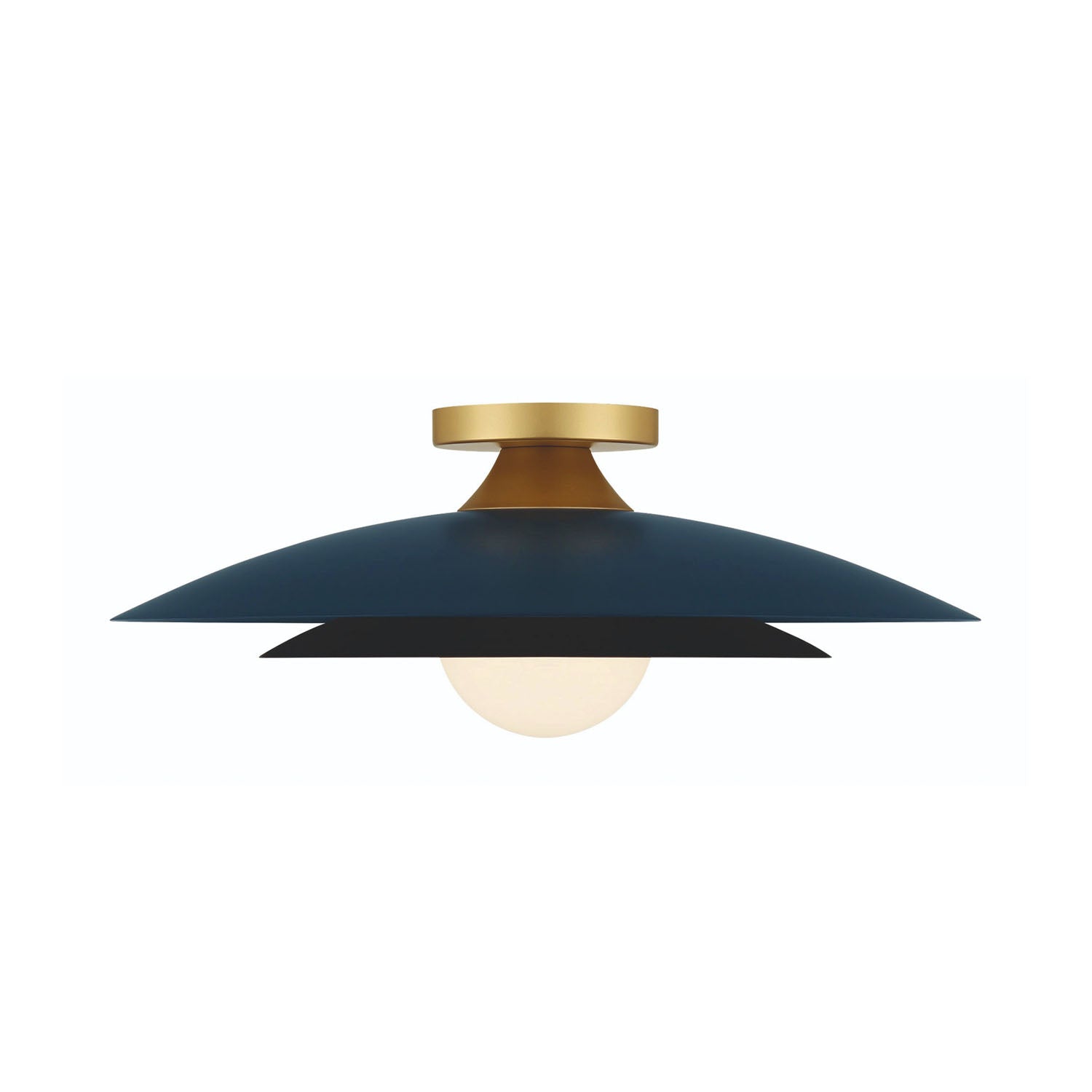 The Yates LED Flush Mount brings bold sophistication to any space with its striking MCM inspired design and matte navy blue finish. This captivating fixture features dual metal shades, finished in matte navy with warm brass accents and an opal glass globe, creating soft, ambient illumination perfect for bedrooms, hallways, or areas with lower ceilings. The matte navy, grey and brass elements with white glass deliver contemporary luxury with a commanding presence. At 18" in diameter with integrated LED technology, this flush mount makes an unforgettable focal point while providing decades of energy-efficient operation.