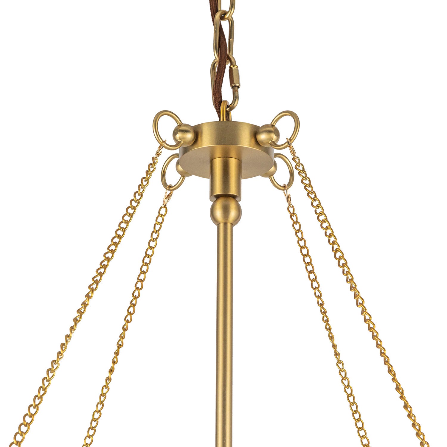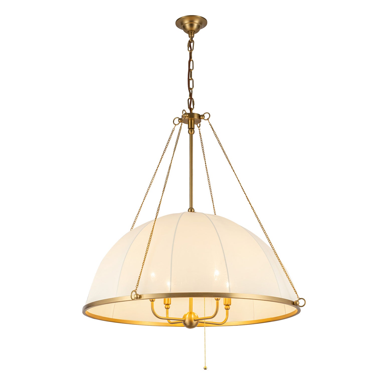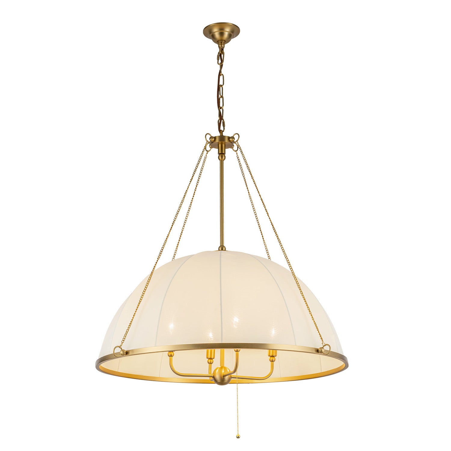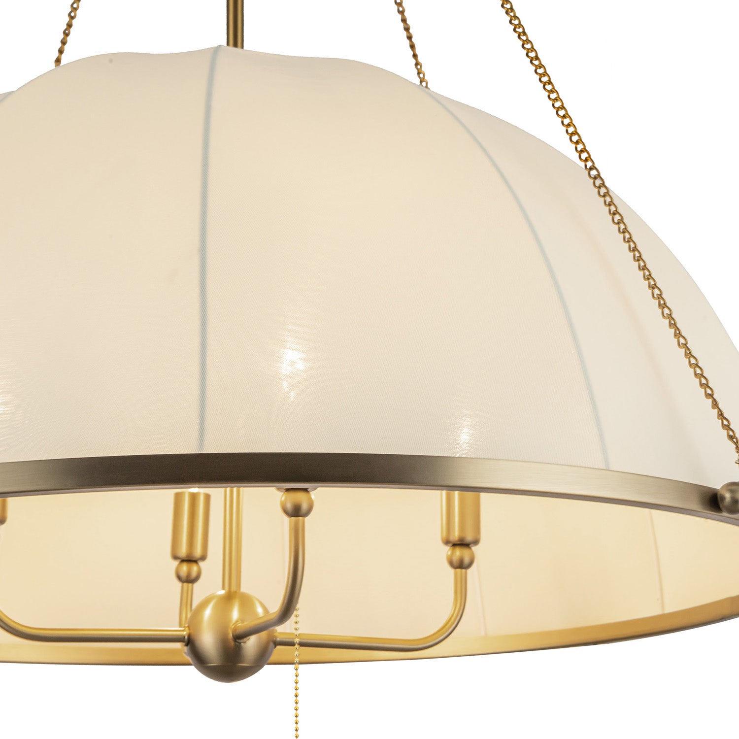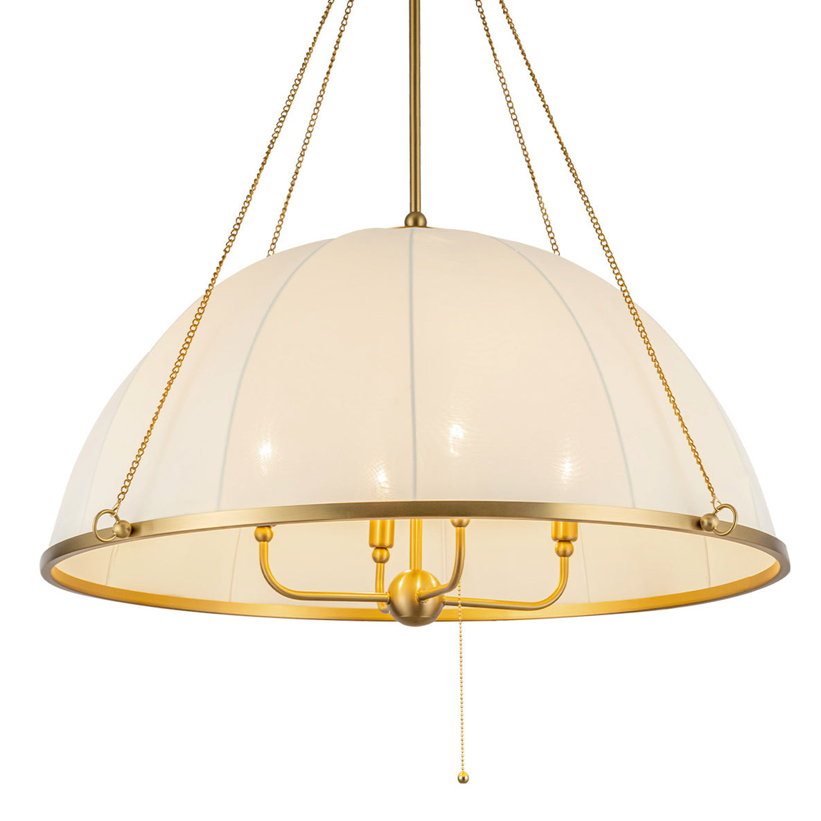 The Trudy Pendant brings elegant vintage charm to interior spaces with its sophisticated parasol-inspired design. This impressive extra-large fixture features a gently curved fabric shade in soft white that diffuses light beautifully while creating a warm, inviting atmosphere. The brushed brass frame and decorative chain suspension system add warmth and luxury to the light shade, with four candelabra lights arranged beneath the dome for generous illumination. The fixture includes an on/off pull chain for convenient operation. Perfect for grand dining areas, spacious living rooms, or open foyers, the Trudy pendant combines timeless silhouettes with refined details to create a dramatic lighting statement that enhances both traditional and transitional interiors.
