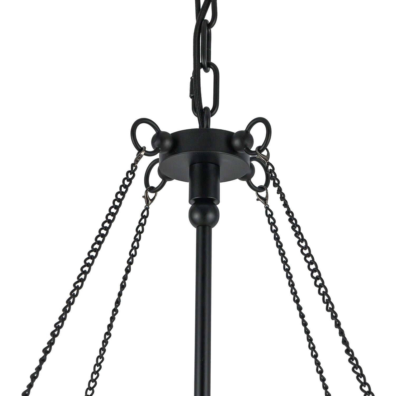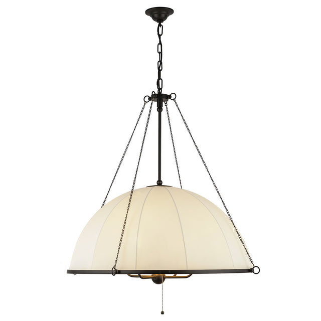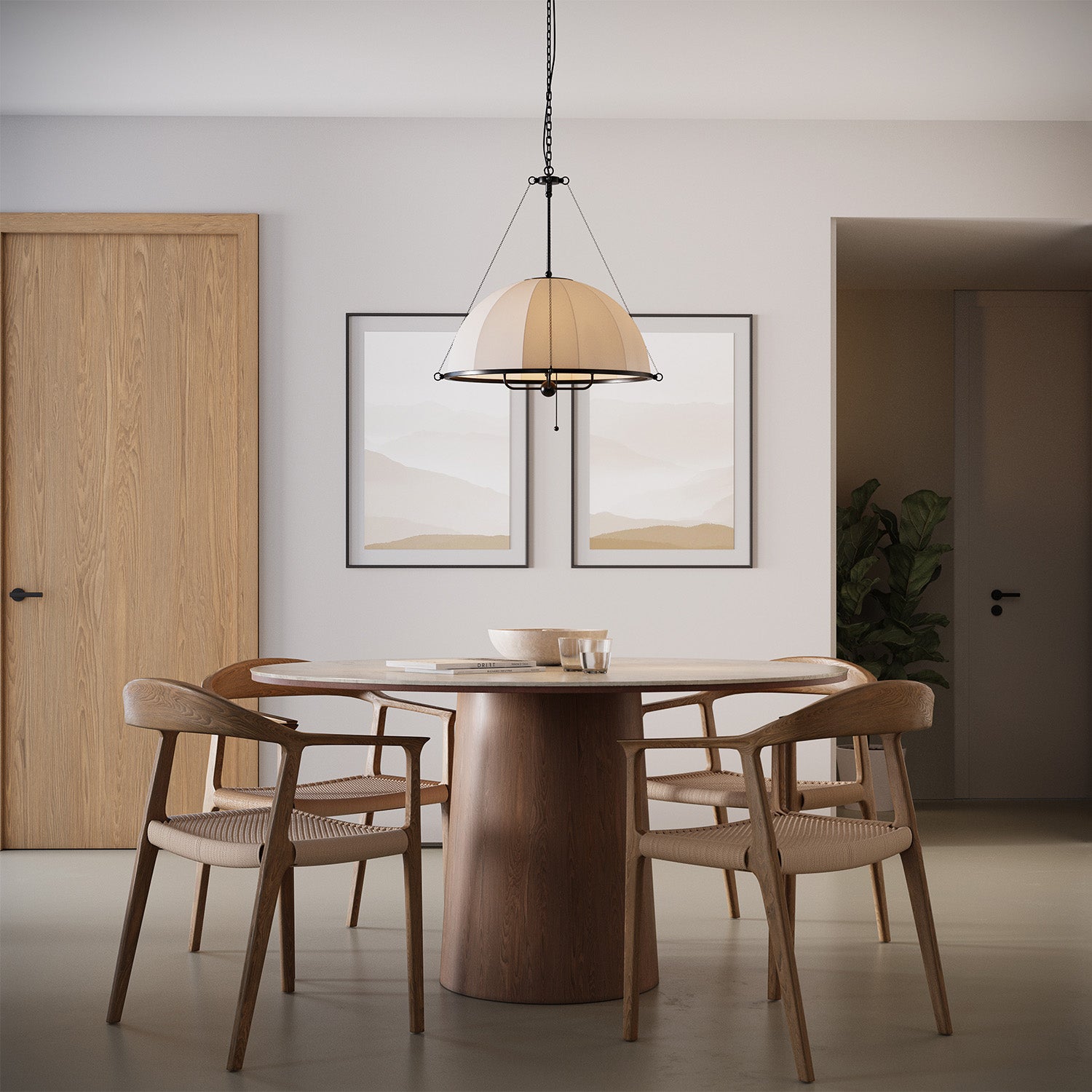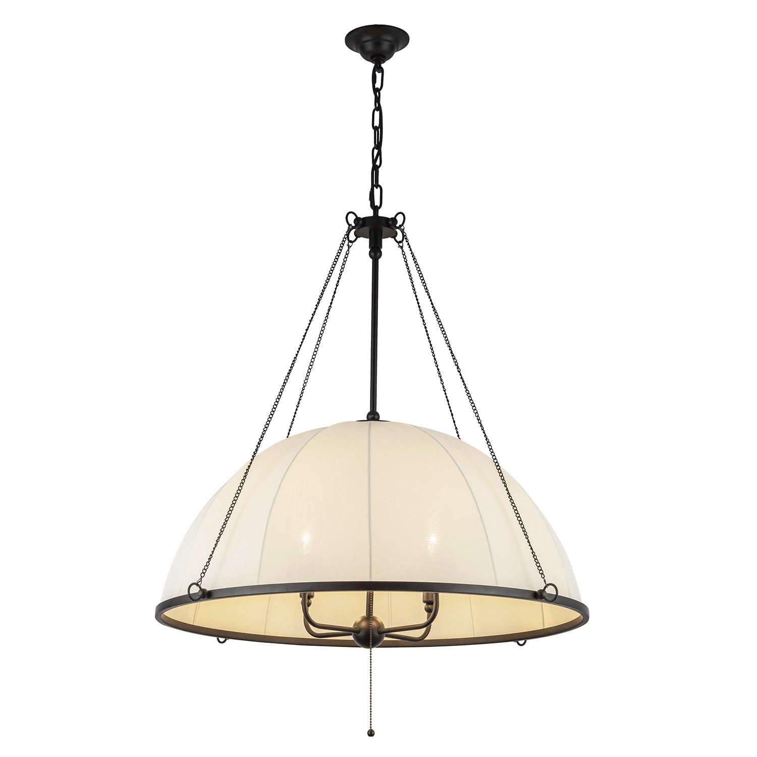 The Trudy Pendant brings elegant vintage charm to interior spaces with its sophisticated parasol-inspired design. This impressive extra-large fixture features a gently curved fabric shade in soft white that diffuses light beautifully while creating a warm, inviting atmosphere. The matte black frame and decorative chain suspension system provide striking contrast to the light shade, with four candelabra lights arranged beneath the dome for generous illumination. The fixture includes an on/off pull chain for convenient operation. Perfect for grand dining areas, spacious living rooms, or open foyers, the Trudy pendant combines timeless silhouettes with refined details to create a dramatic lighting statement that enhances both traditional and transitional interiors.