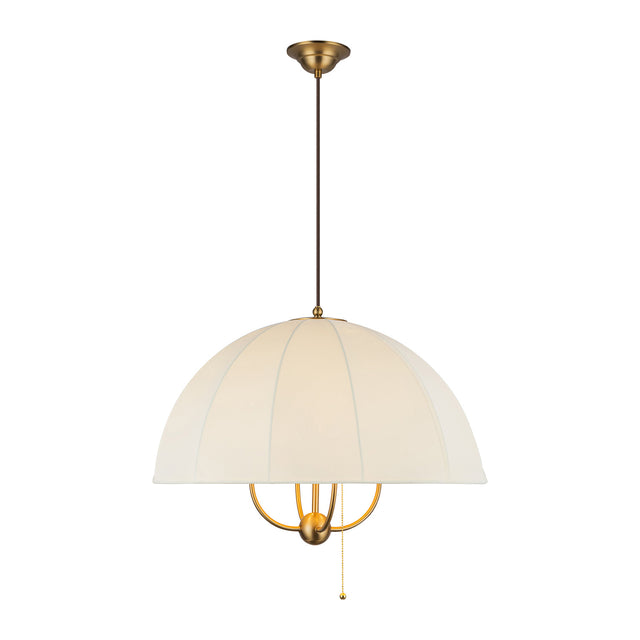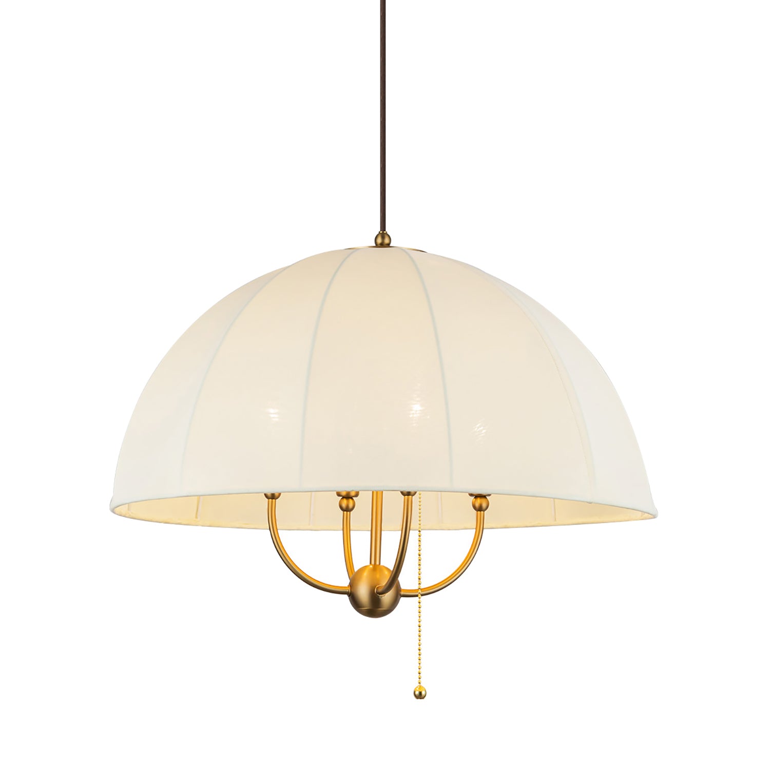 The Trudy Pendant brings elegant vintage charm to interior spaces with its sophisticated parasol-inspired design. This striking fixture features a gently curved fabric shade in soft white that diffuses light beautifully while creating a warm, inviting atmosphere. The brushed brass frame adds a touch of warmth and luxury to the light shade, with four candelabra lights arranged beneath the dome for even illumination. The fixture includes an on/off pull chain for convenient operation. Perfect for dining areas, living rooms, or bedrooms, the Trudy pendant combines timeless silhouettes with refined details to create a lighting statement that enhances both traditional and transitional interiors.