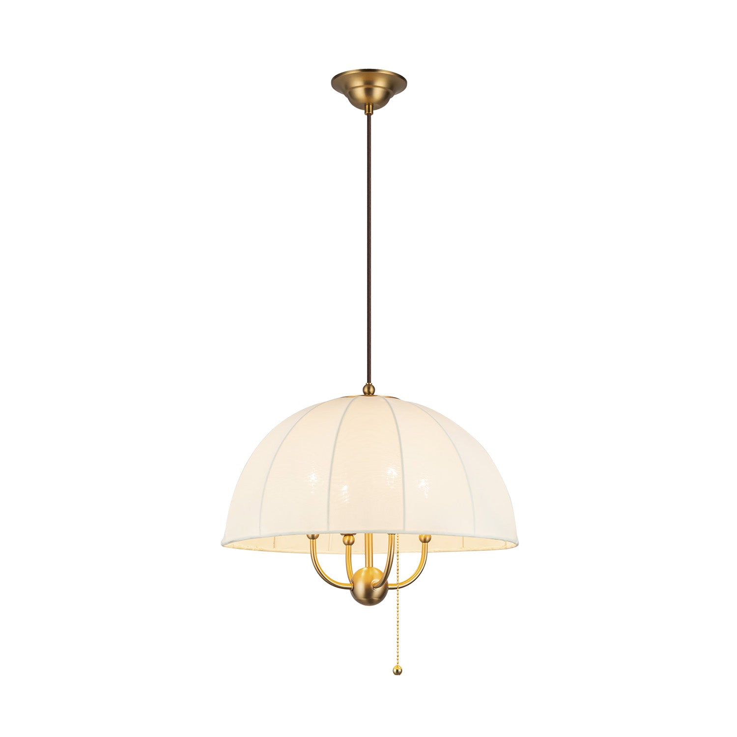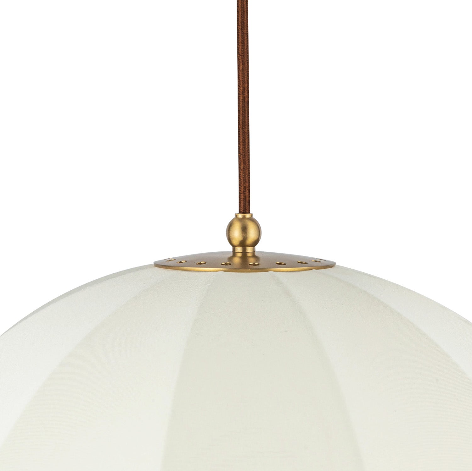 • Vintage-inspired pendant with off-white fabric dome shade and brushed brass hardware