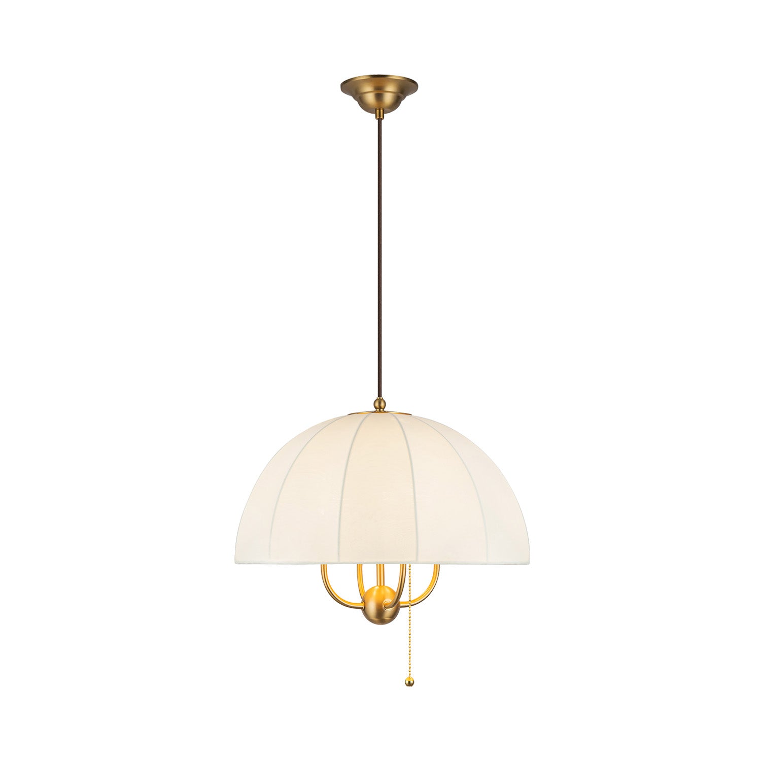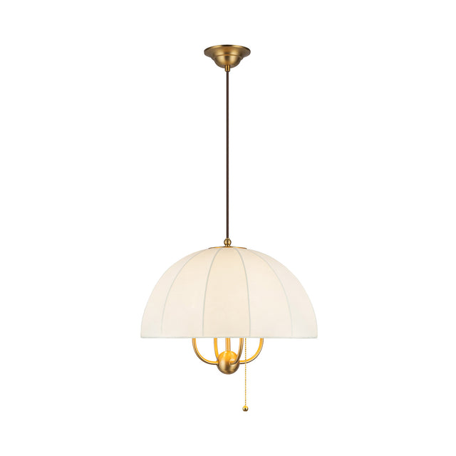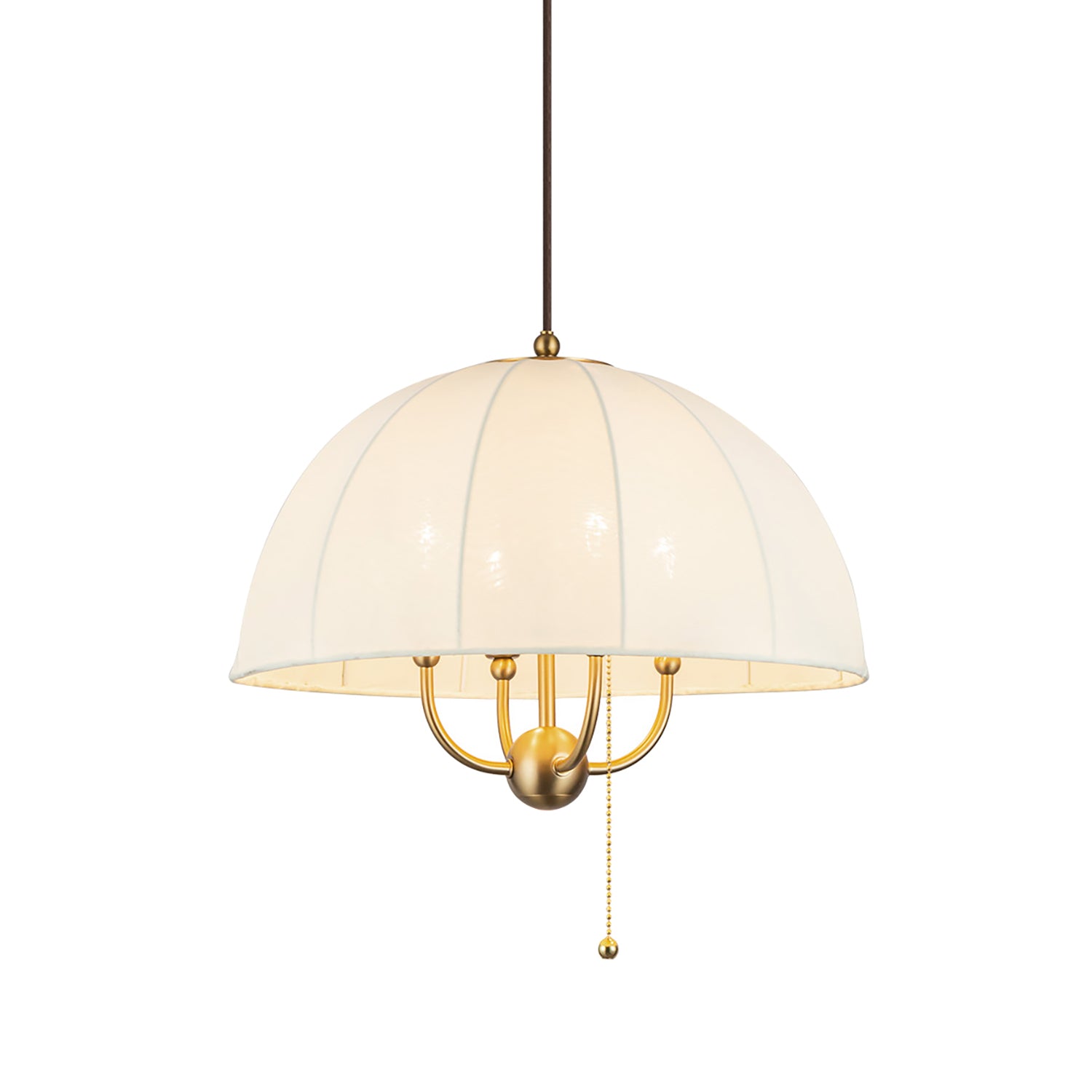 The Trudy Pendant brings elegant vintage charm to interior spaces with its sophisticated parasol-inspired design. This striking fixture features a gently curved fabric shade in soft white that diffuses light beautifully while creating a warm, inviting atmosphere. The brushed brass frame adds a touch of warmth and luxury to the light shade, with four candelabra lights arranged beneath the dome for even illumination. The fixture includes an on/off pull chain for convenient operation. Perfect for dining areas, living rooms, or bedrooms, the Trudy pendant combines timeless silhouettes with refined details to create a lighting statement that enhances both traditional and transitional interiors.