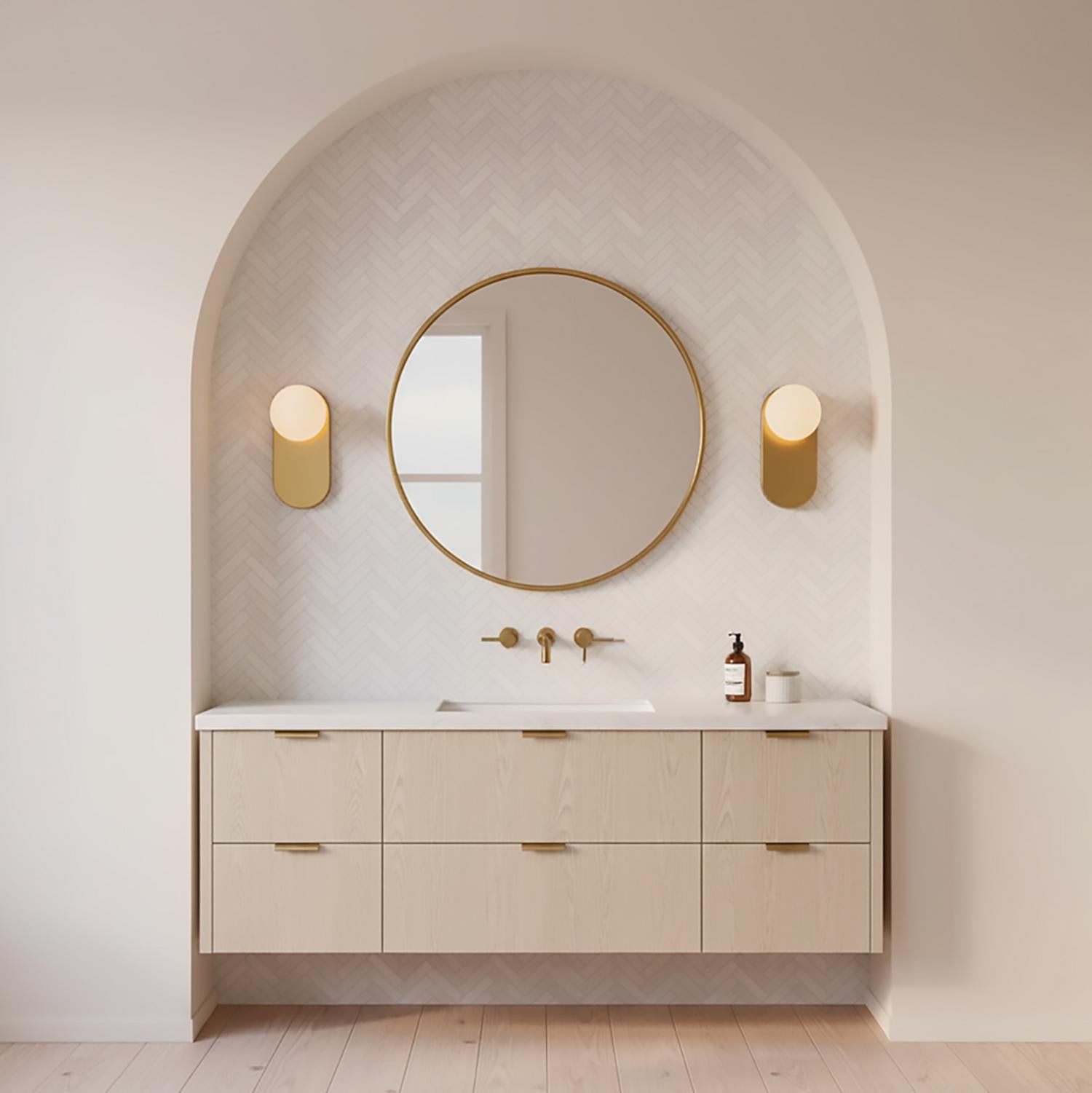 The Enzo Wall Sconce brings contemporary sophistication to interior spaces with its distinctive pill-shaped design. This elegant fixture features a sleek brushed brass backplate with a perfectly proportioned opal glass globe positioned at the top edge, creating a balanced asymmetrical composition. The smooth opal glass diffuser provides beautiful, evenly distributed illumination while the warm brass finish adds a touch of luxury to the modern silhouette. Perfect for hallways, bathrooms, bedrooms, or commercial spaces, the Enzo sconce combines artistic form with functional lighting to create a refined design statement.