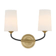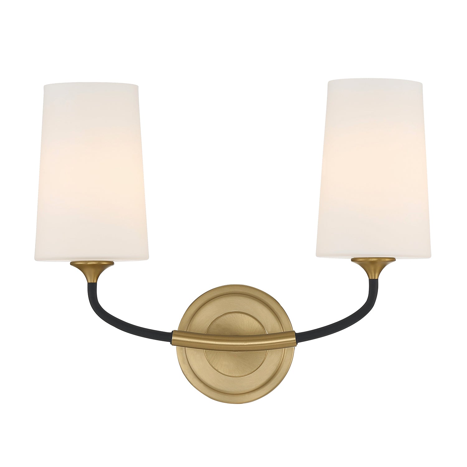 The Logan 2 Light Vanity features a striking design with black forged metal and brushed brass accents. Two symmetrical curved arms extend outward, each supporting a tapered white opal glass shade that provides soft, even illumination. This wall-mounted fixture measures 15" wide and 12" high, making it ideal for bathrooms, powder rooms, or hallways. The mixed-metal finish creates visual interest while the classic silhouette complements various interior styles from contemporary to industrial. Coordinate with other pieces in the Logan Collection for a unified lighting design throughout your home.