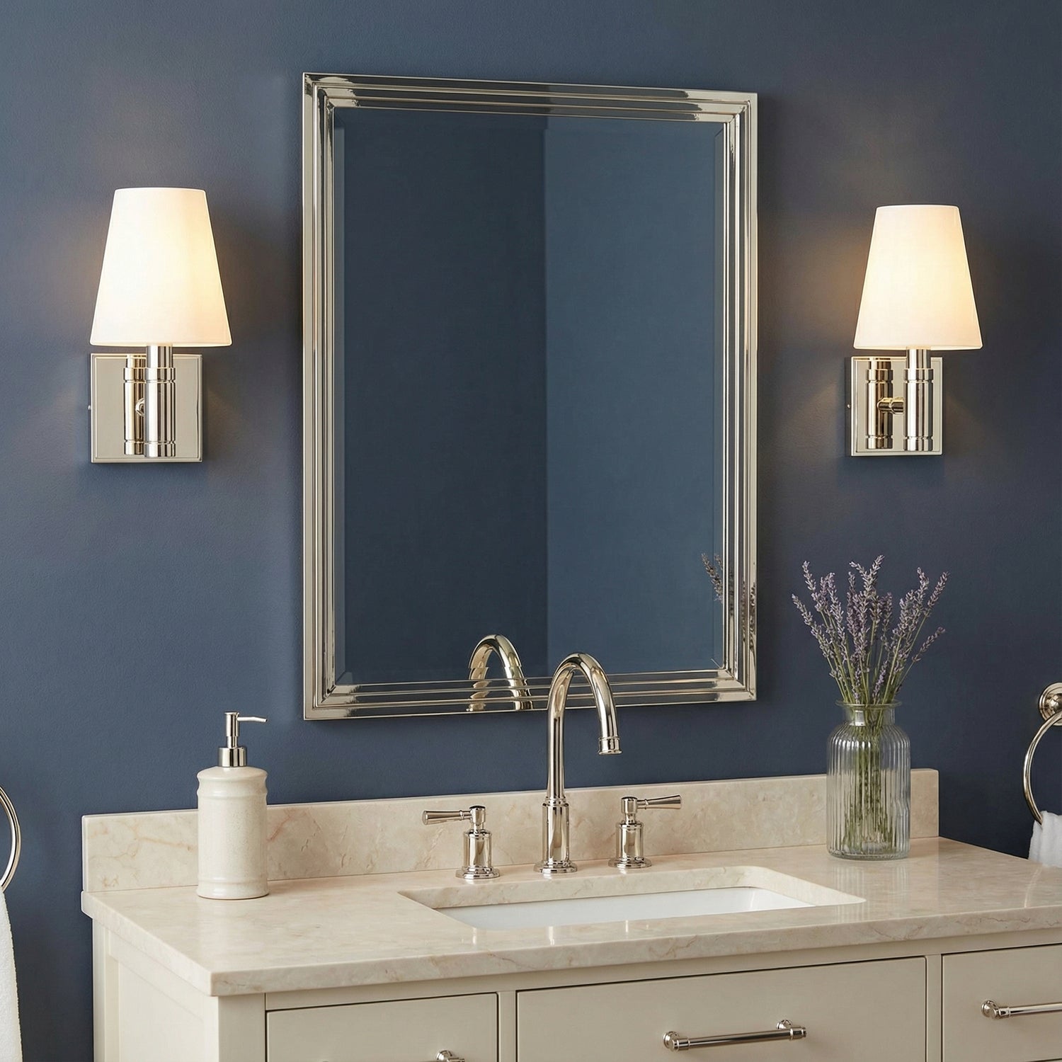 • The brilliant polished nickel finish offers a sleek, reflective sheen that enhances the fixture's clean silhouette