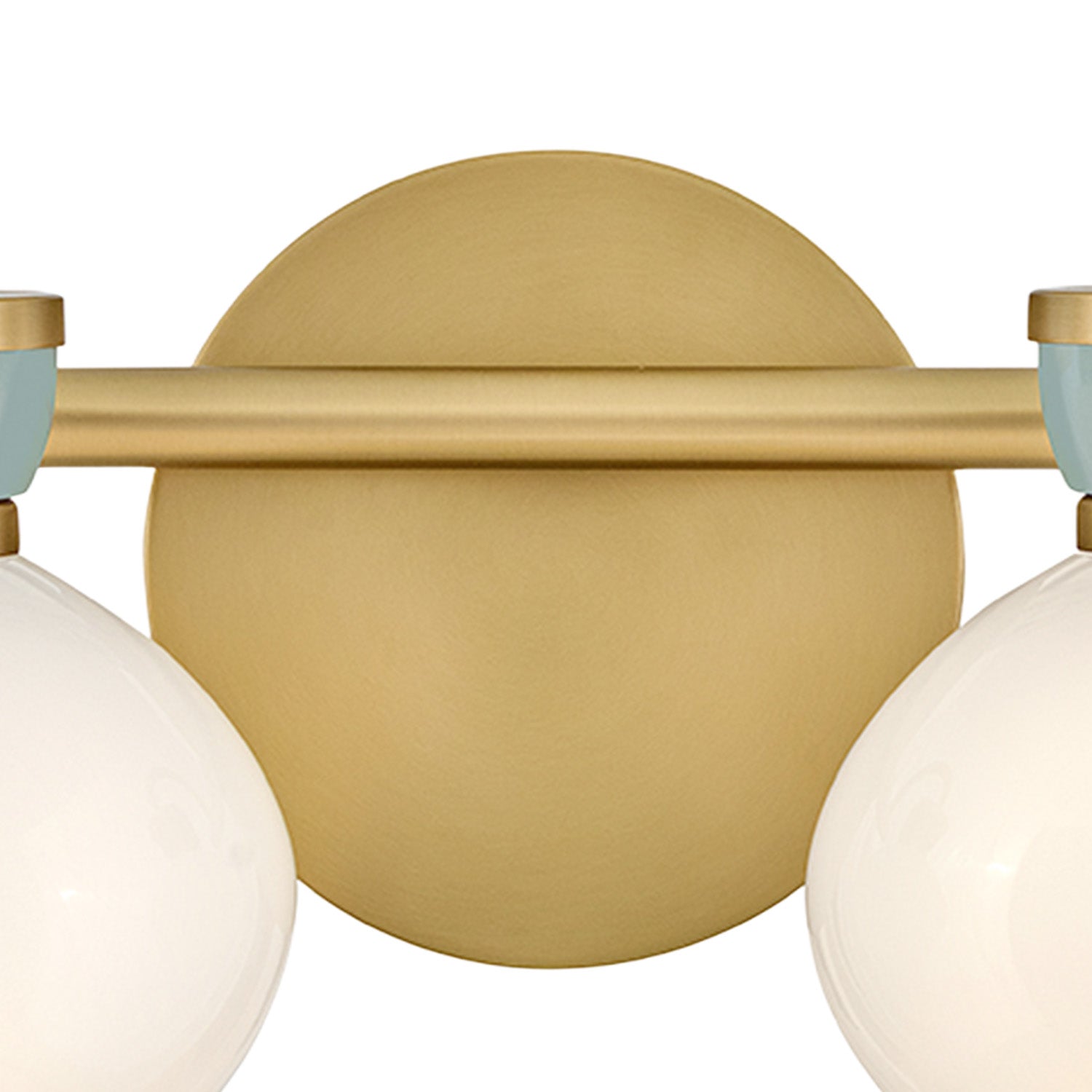 The Piper 2 Light Vanity makes a playful statement, defined by its bold, organic glass and elegant color contrast. This fixture features a horizontal bar with two gently curved arms, each supporting a unique opal glass globe accented by a distinctive aquaverde cuff. The result is a warm, diffused glow that fills the space with balanced illumination, making this an ideal choice for a bathroom or powder room. With its ETL damp rating, it offers both functional beauty and versatile appeal. The sophisticated two-toned finish of satin brass and aquaverde adds a touch of modern vibrancy, delivering enduring style and a perfect blend of elegance and simplicity.