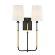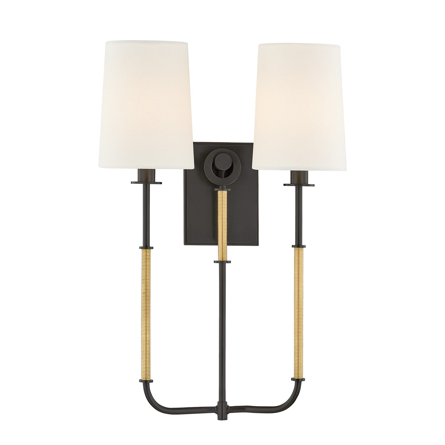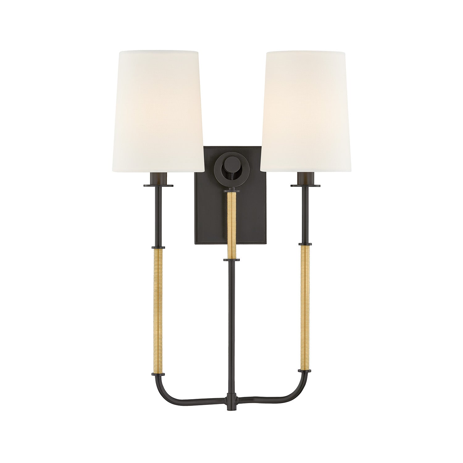 • Pratt features a double-light wall sconce with twin arcing arms, wrapped metal detailing, and fabric shades for a balanced, antique-inspired silhouette